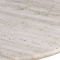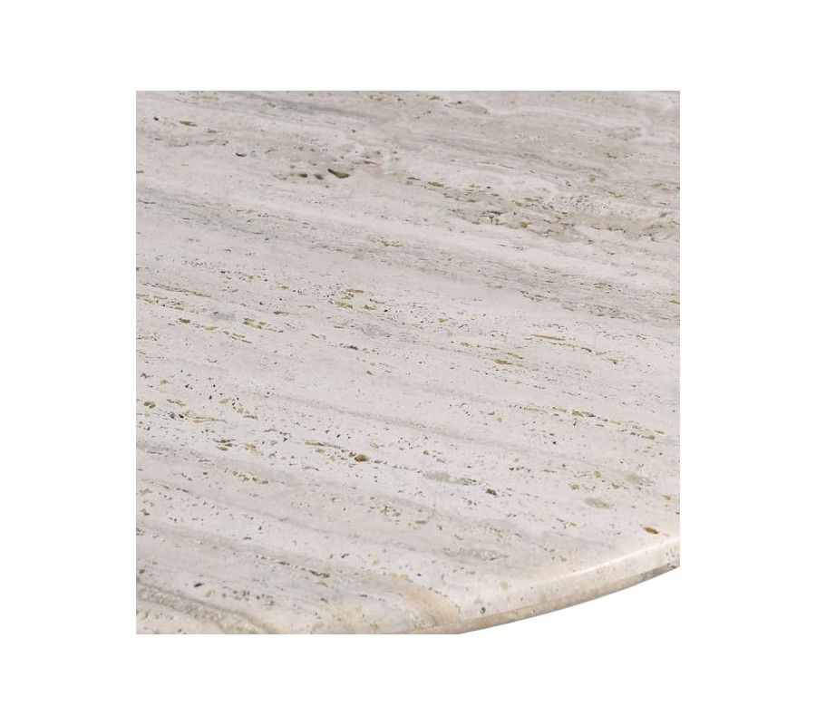 Jedálenský stôl Traverte je dokonalým spojením luxusu, prírodných materiálov a moderného dizajnu. Má oválny tvar vrchnej bielej dosky, ktorá je vyrobená z travertínového kameňa, známeho svojou jemnou štruktúrou a prirodzenou farebnou variabilitou. Povrch dosky je hladký, leštený a zachováva prirodzenú textúru kameňa, čím pridáva eleganciu a jedinečný charakter.