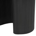 Noha stola sú neštandardného dizajnu, tvarovaná ako masívny, vertikálny zaoblený prvok. Je kombináciou mosadzných plátov a dreva, ktoré sú precízne spracované a vytvárajú zaujímavý vizuálny kontrast k svetlej doske. Povrch nohy má jemne ryhovanú štruktúru, ktorá pridáva na hĺbke a vizuálnej komplexnosti. Čierna farba nohy stola vytvára dokonalý kontrast s prirodzeným travertínovým odtieňom vrchnej dosky.