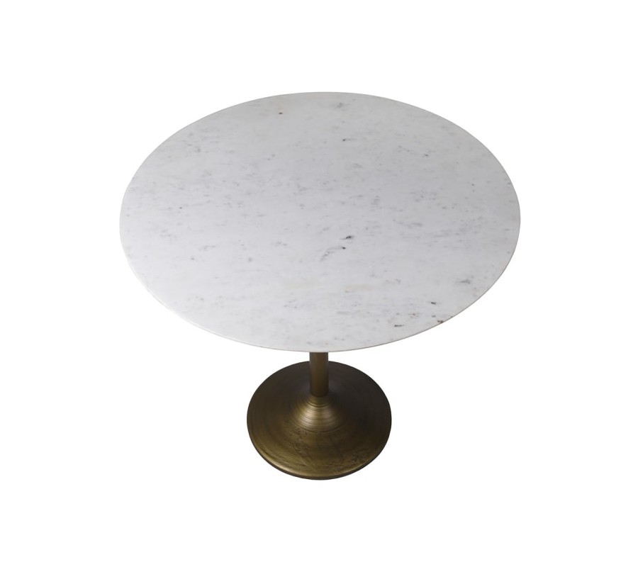 Luxusný charakter mramoru výborne dopĺňa kovová noha v zlatom prevedení. Jej povrch zdobí jemná patina, ktorý ho mierne zmatňuje a zároveň dodáva nábytku štýlový vintage vizuál. Noha je štíhla, valcovitého tvaru a v spodnej časti prechádza do rozšírenej okrúhlej podstavy, zabezpečujúcej výbornú stabilitu.