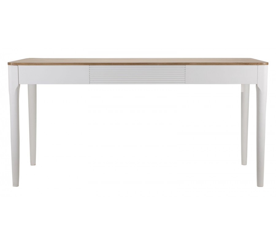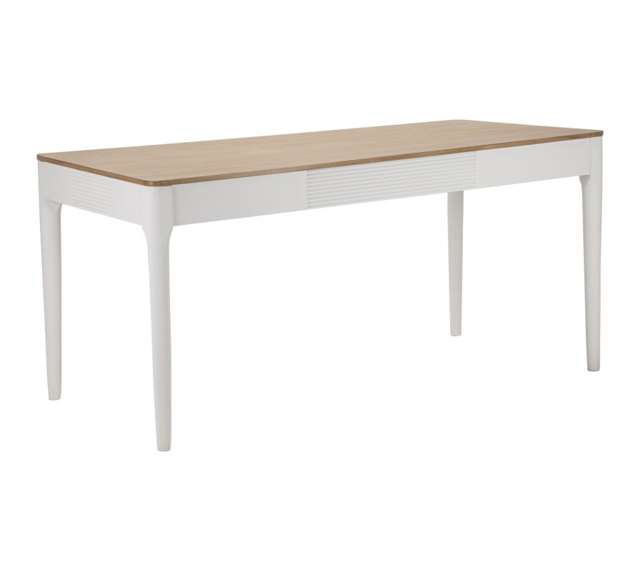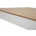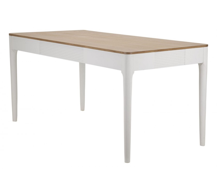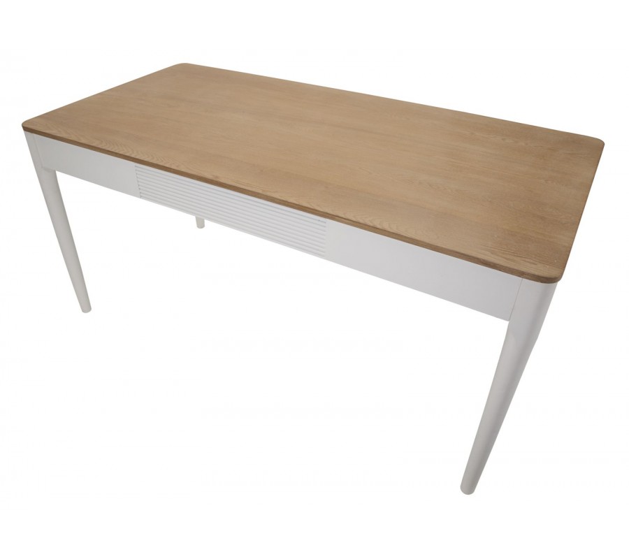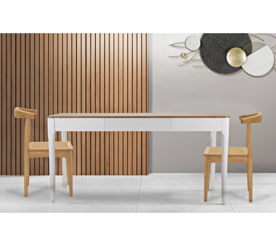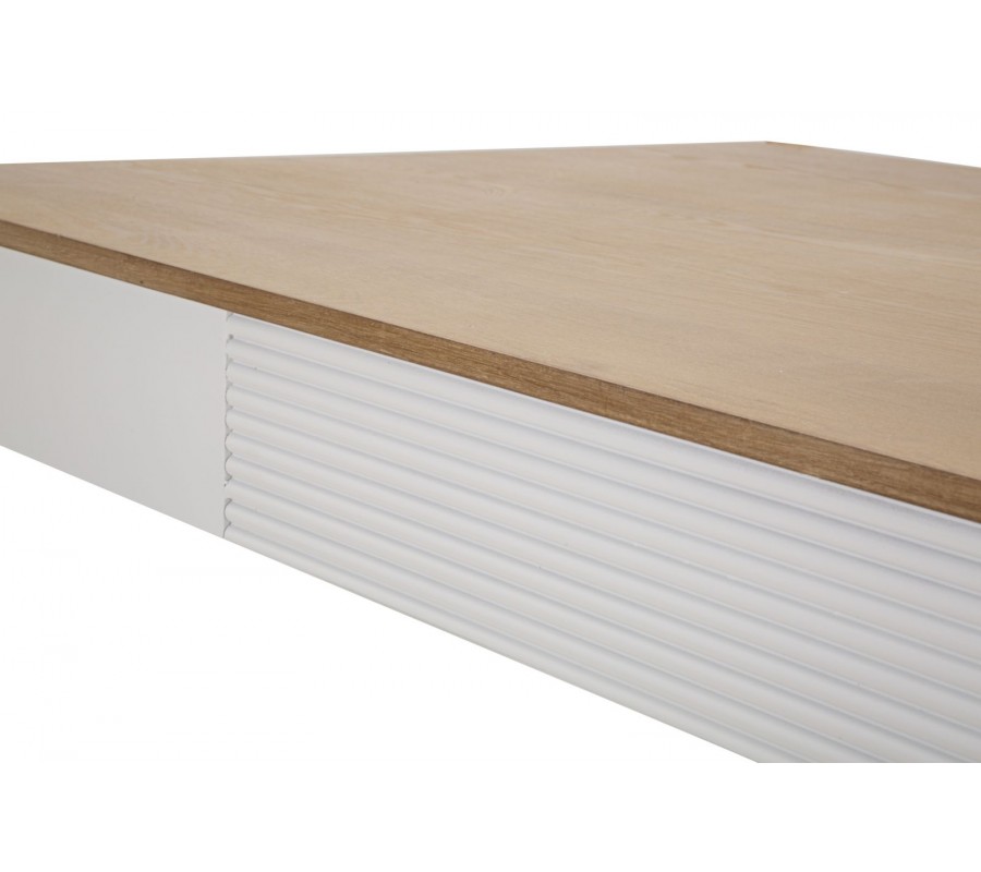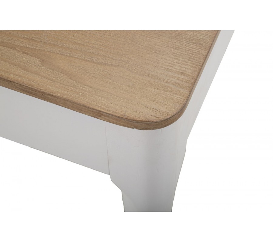 Vrchná doska stola je vyhotovená v prírodnom odtieni dreva, ktorý vytvára harmonický kontrast s bielou konštrukciou. Povrch je hladký, jemne brúsený a ošetrený tak, aby zvýraznil prirodzenú kresbu dreva, čím dodáva stolu autentický a prírodný charakter.