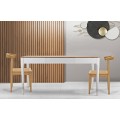 Stôl je ideálnou voľbou do jedálne alebo kuchyne, kde vynikne svojím luxusným a nadčasovým dizajnom. Perfektne sa kombinuje so zamatovými alebo čalúnenými stoličkami v neutrálnych odtieňoch, so zlatými alebo mosadznými doplnkami a so sklenenými či mramorovými dekoráciami. Jeho elegantná kombinácia bielej farby a prírodného dreva umožňuje jednoduché začlenenie do svetlých aj tmavších interiérov, kde pridáva sofistikovaný a štýlový prvok. Za stôl pohodlne usadíte až šesť osôb.