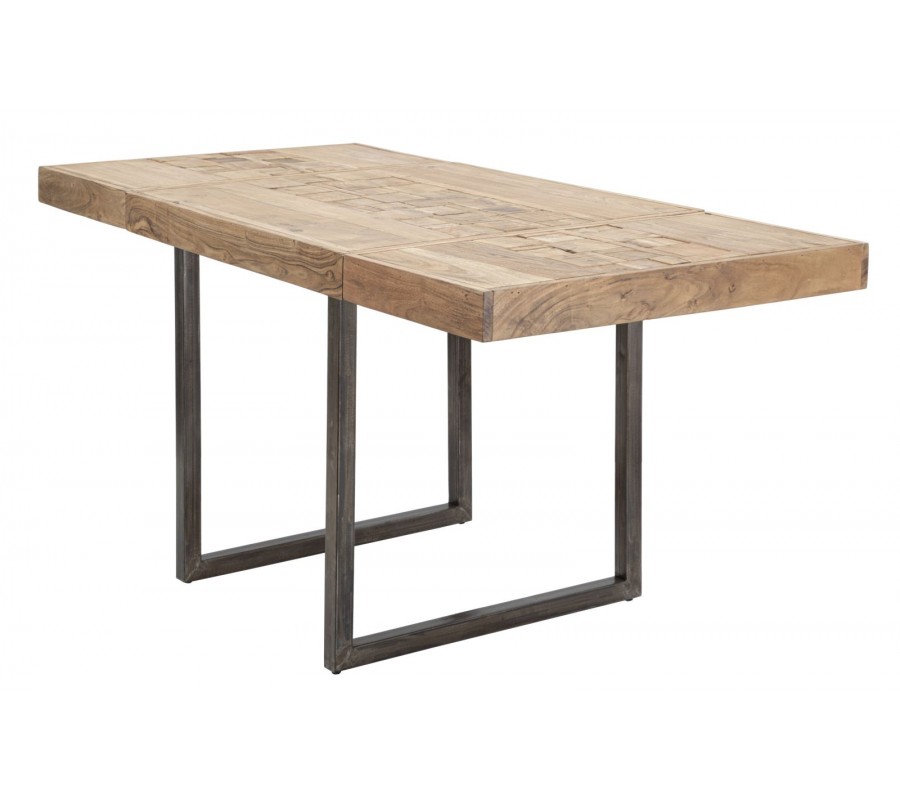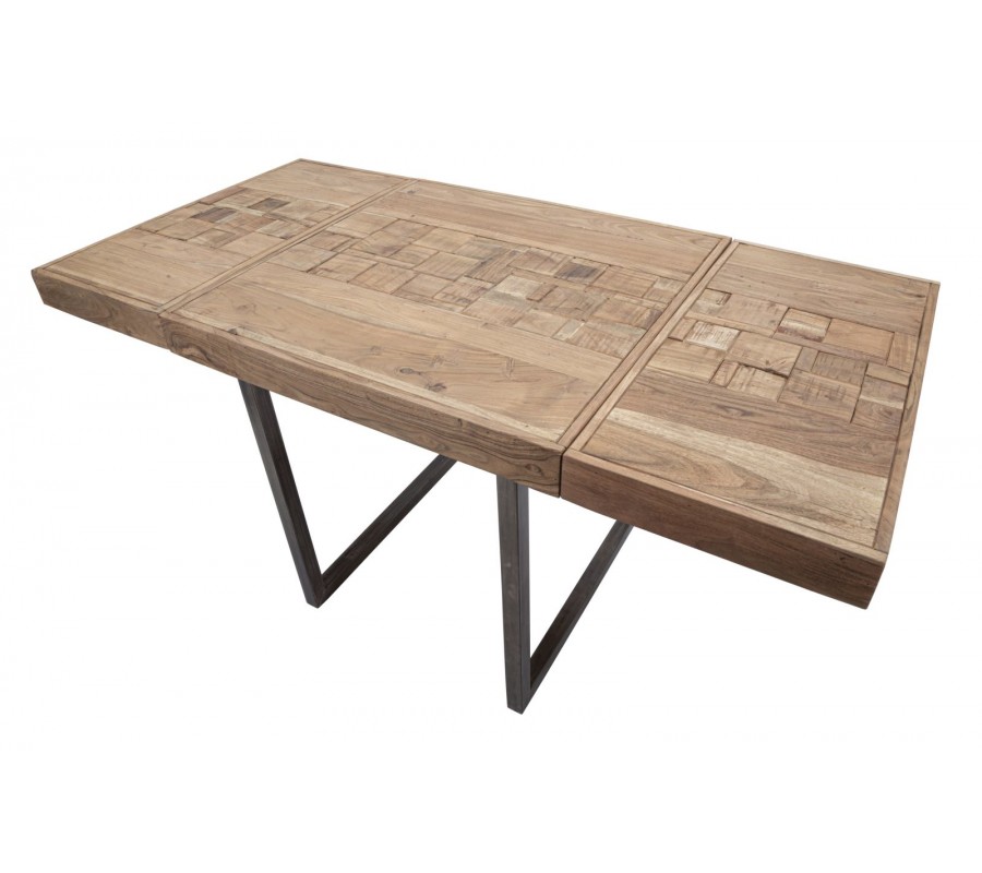 Masívny moderný jedálenský stôl Cubilio z hnedého akáciového dreva so vzorovanou mozaikou a čiernymi nožičkami z kovu 80-160 cm