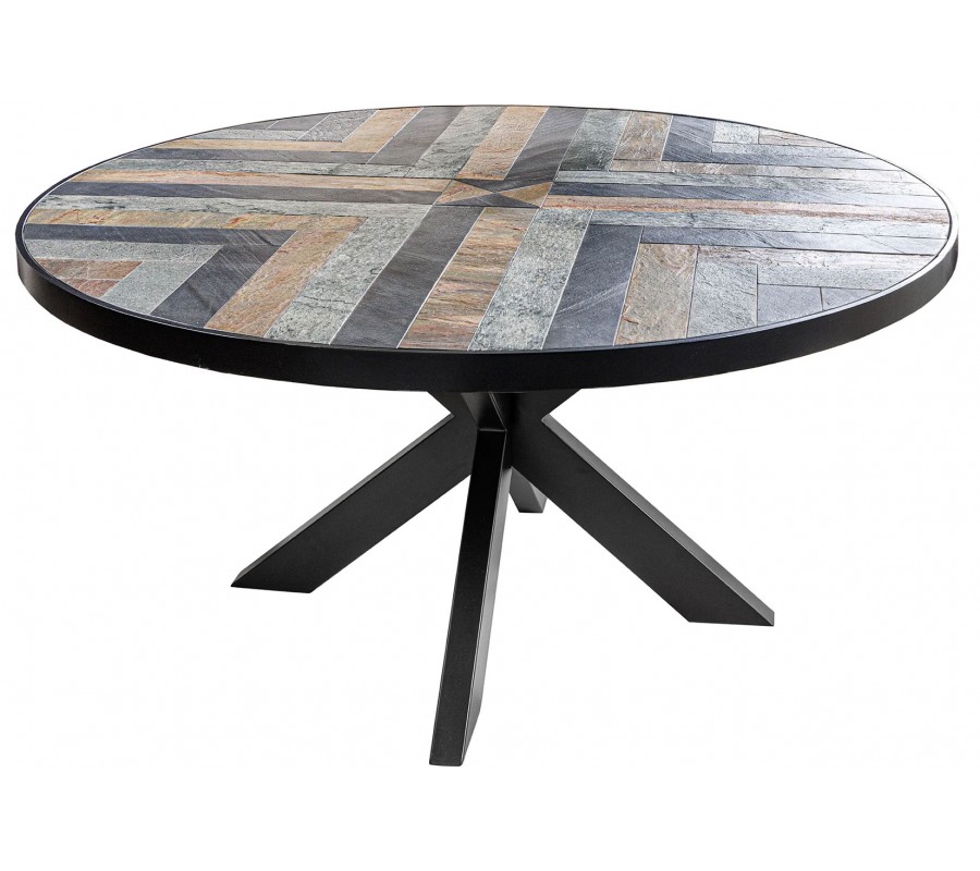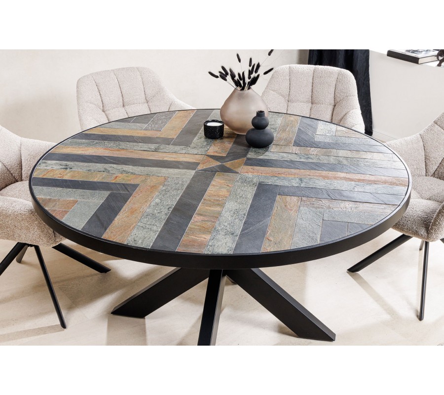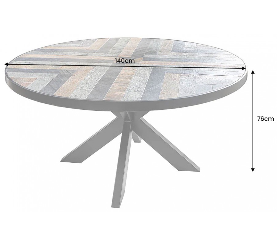 Dizajnový okrúhly jedálenský stôl Mavro s doskou s mozaikovým vzorom rybej kosti v odtieňoch hnedej šedej a čiernej 140 cm