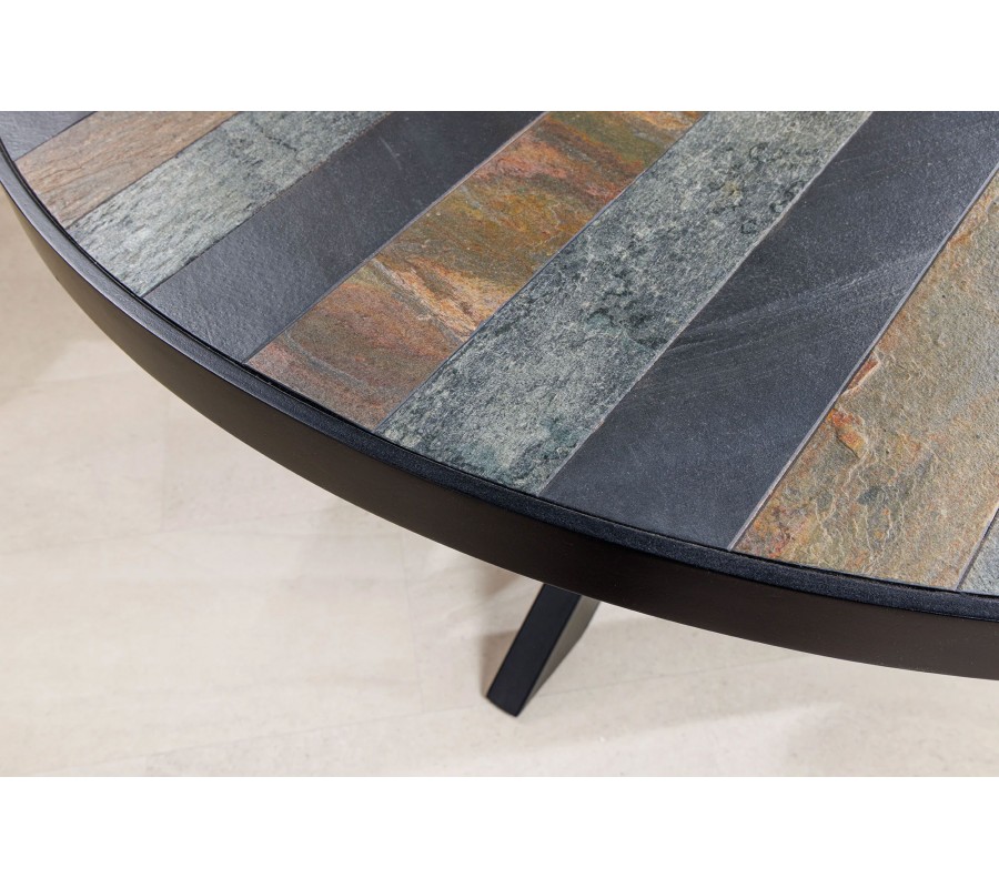 Jedálenský stôl Mavro vyniká svojim okrúhlym tvarom a unikátnou mozaikovou doskou s rybím vzorom, ktorá dodáva interiéru výrazný vizuálny prvok. Vrchná doska je vyrobená z MDF dyhy a vyniká detailným spracovaním, ktoré imituje prírodný kameň v hnedých, sivých a čiernych tónoch. Precízne uložené obdĺžnikové segmenty vytvárajú vzor rybej kosti, ktorý pôsobí elegantne a zároveň dynamicky. Čierny rámovaný okraj po obvode stolovej dosky dodáva štruktúre pevnosť a zvýrazňuje kontrast medzi prírodnými tónmi a tmavým lemovaním.