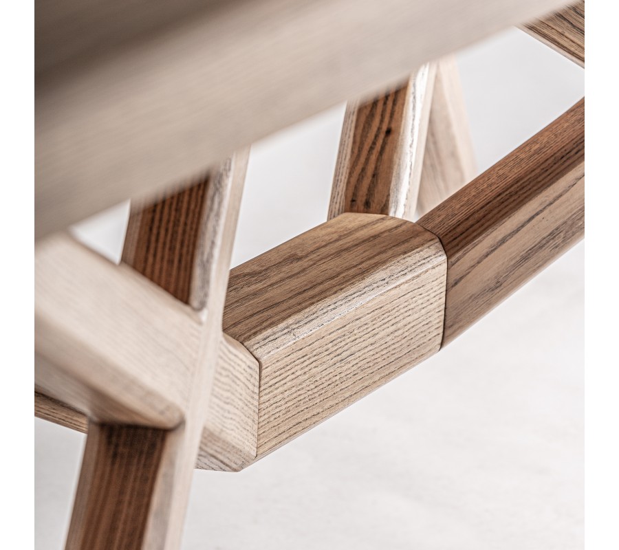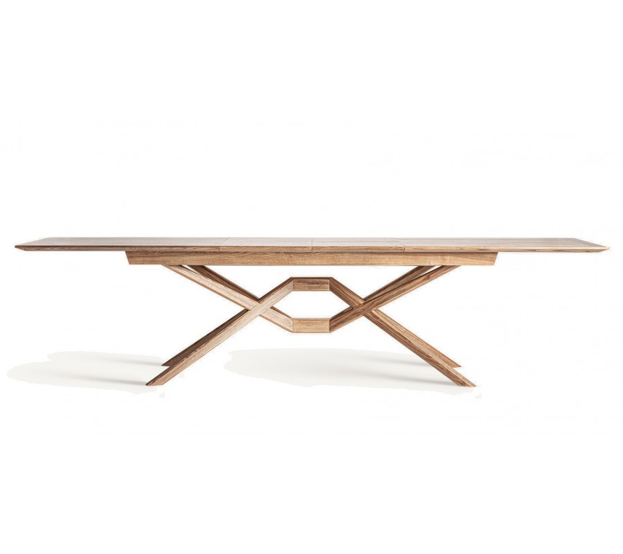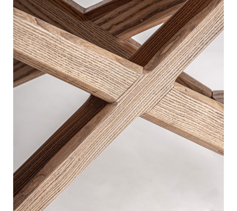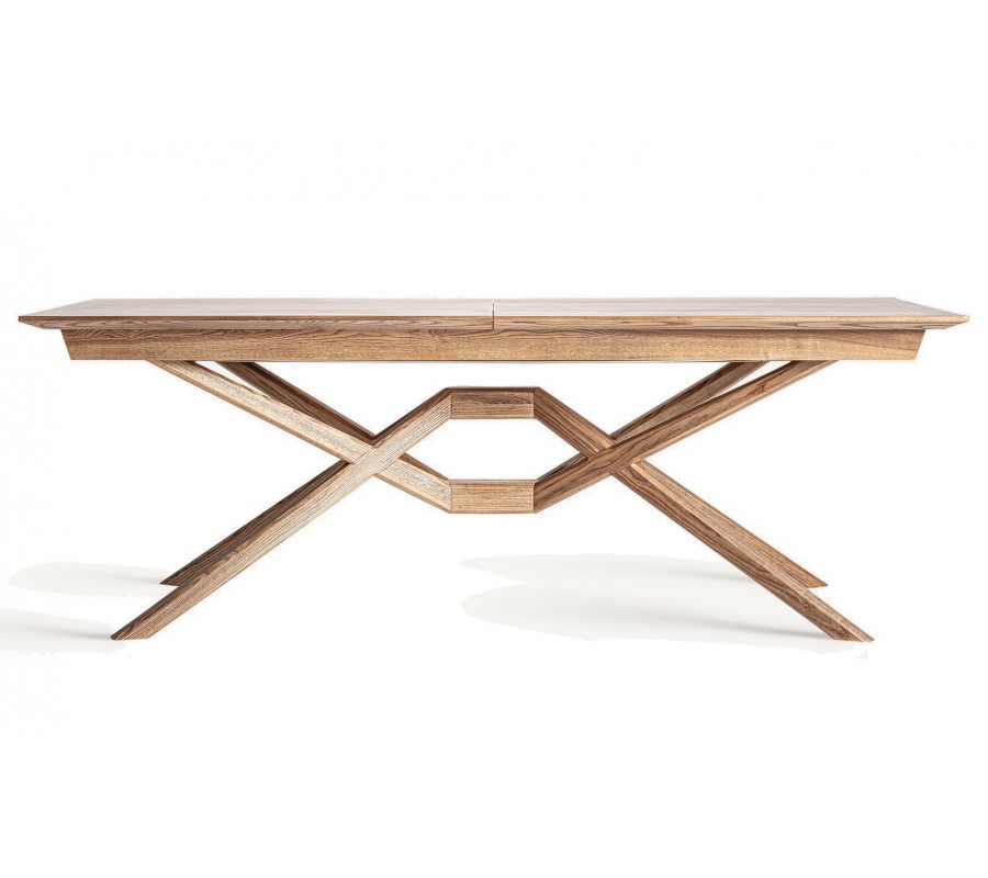Najvýraznejším prvkom tohto jedinečného stola sú jeho prekrížené geometrické nožičky, ktoré vytvárajú zaujímavú priestorovú kompozíciu. Sú zložené z dvoch identických častí, pričom jedna je pevne pripevnená k doske a druhá je otočená a prepletená cez tú prvú, čím spolu tvoria pevný a stabilný podstavec s umeleckým nádychom. Tento premyslený dizajn nielen zabezpečuje výnimočnú stabilitu, ale zároveň dodáva stolu dynamický a luxusný charakter.