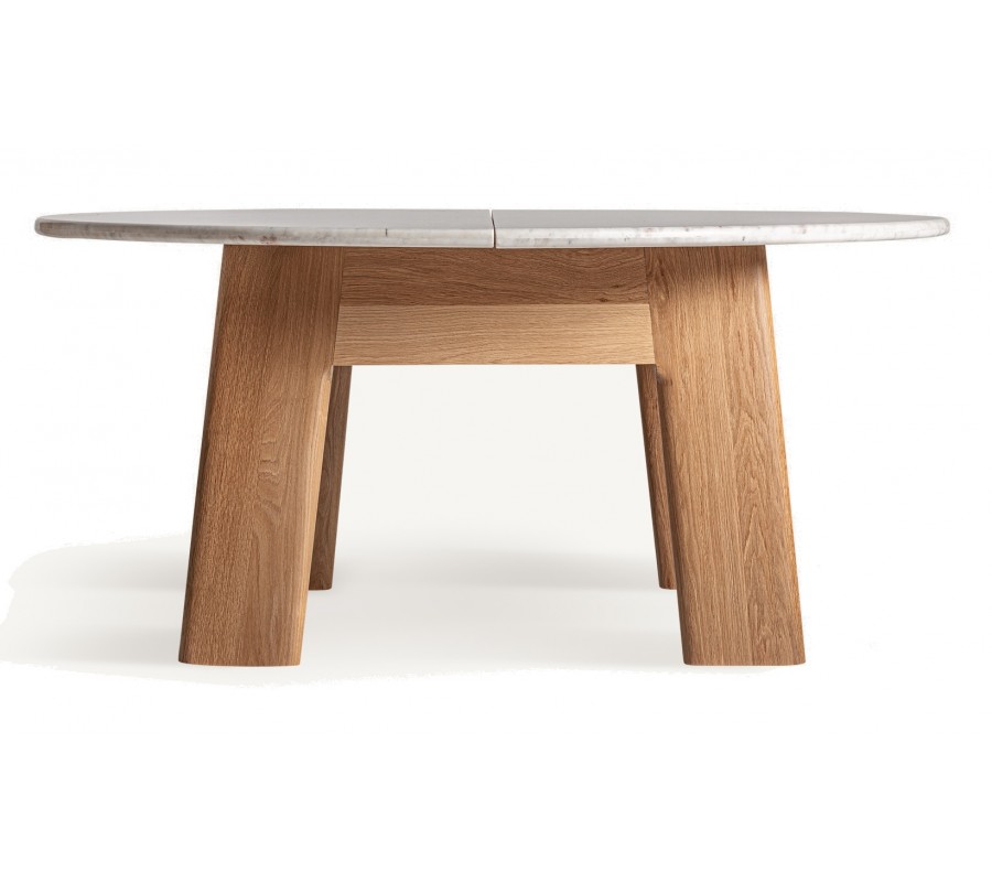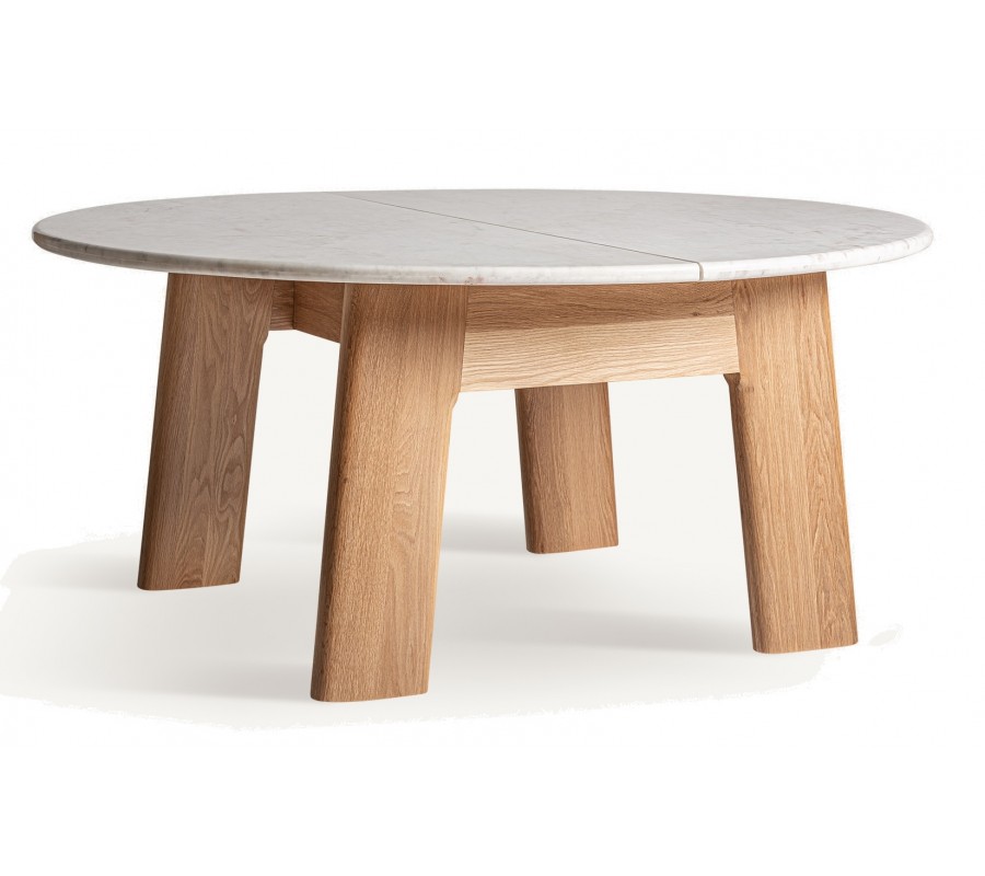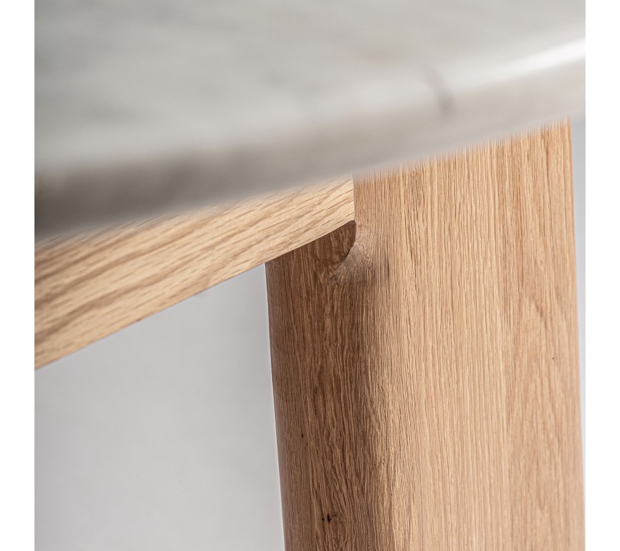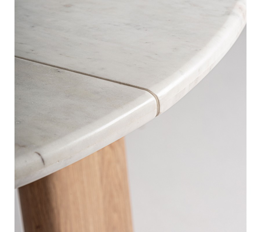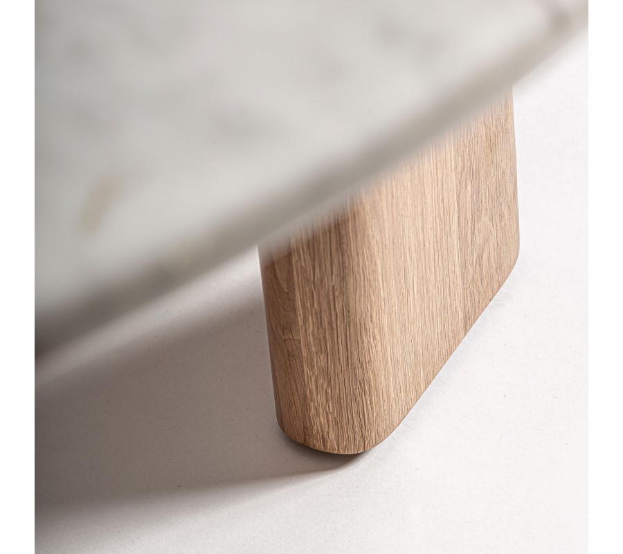 Luxusný škandinávsky jedálenský stôl Naria v okrúhlom tvare kombinuje elegantný mramor s prírodným dubovým drevom, čím vytvára dokonalú rovnováhu medzi nadčasovým dizajnom a funkčnosťou. Vrchná doska z bieleho mramoru so sivými žilkami, je predelená v strede, čím dodáva stolíku jedinečný vzhľad. Zaoblené hrany dosky aj nôh podčiarkujú jemnosť a plynulé línie dizajnu.