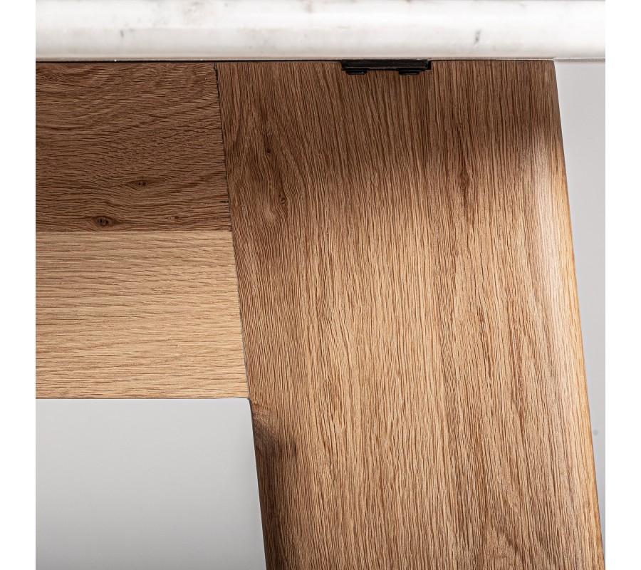 Masívne nožičky z dubového dreva v hnedej farbe majú výraznú štruktúru letokruhov, ktorá zdôrazňuje prírodný charakter stolíka. Lakovaný povrch zabezpečuje dlhú životnosť a jednoduchú údržbu. Stabilitu a pevnosť konštrukcie zaručujú spojovacie dosky pod vrchnou doskou, ktoré vizuálne aj funkčne prepájajú jednotlivé časti stolíka.