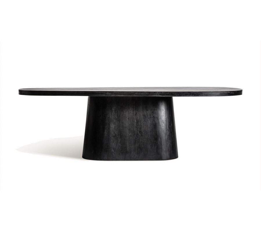 Luxusný art deco geometrický jedálenský stôl Jerisad upúta na prvý pohľad svojím impozantným dizajnom a mohutnou konštrukciou. Jeho oválna vrchná doska je vyrobená z masívneho mangového dreva, pričom jej povrch je nelakovaný, čo zvýrazňuje prirodzenú štruktúru letokruhov a autentický charakter dreva. Čierne tónovanie pridáva sofistikovaný a moderný vzhľad, ktorý sa perfektne hodí do elegantných interiérov.