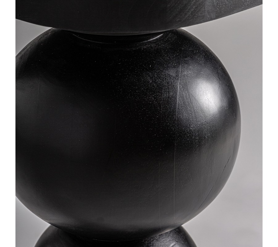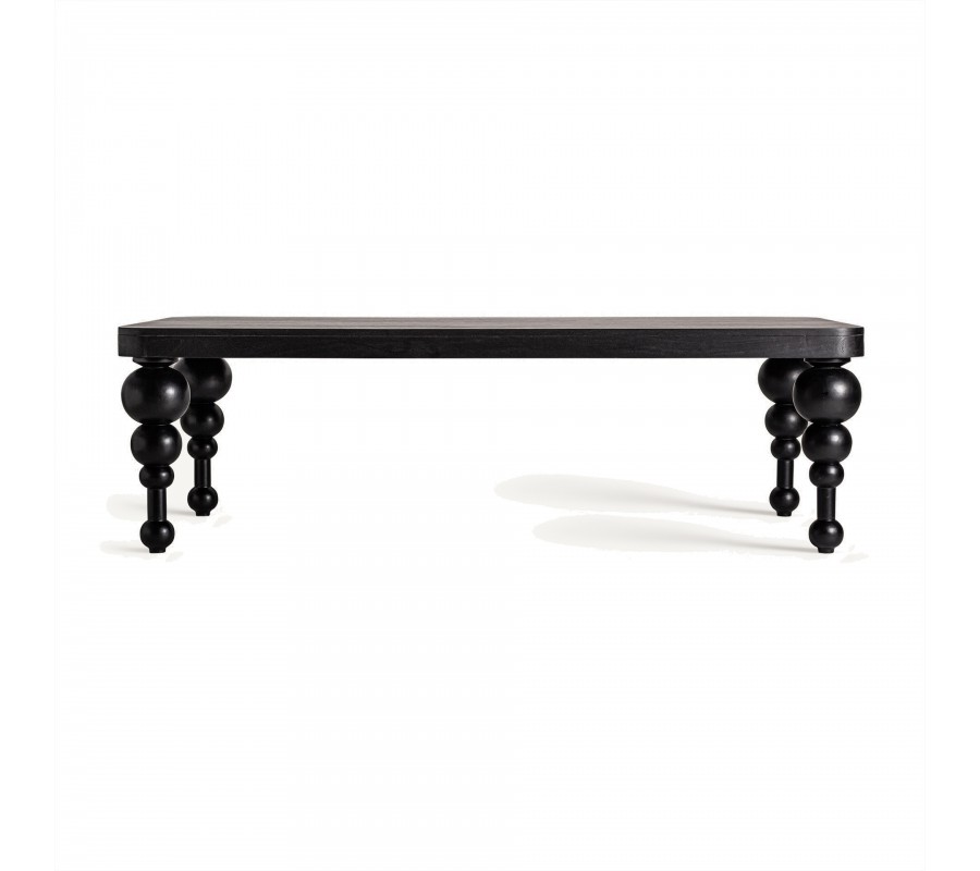 Najvýraznejším prvkom tohto jedálenského stola sú štyri robustné vyrezávané nohy, ktoré sú zdobené naskladanými guľatými detailmi rôznych veľkostí. Tento dekoratívny prvok evokuje tradičné remeselné techniky, no v modernom prevedení, vďaka čomu pôsobí nadčasovo a štýlovo. Zaoblené rohy vrchnej dosky zjemňujú celkový dizajn a dodávajú stolu vyváženú eleganciu.