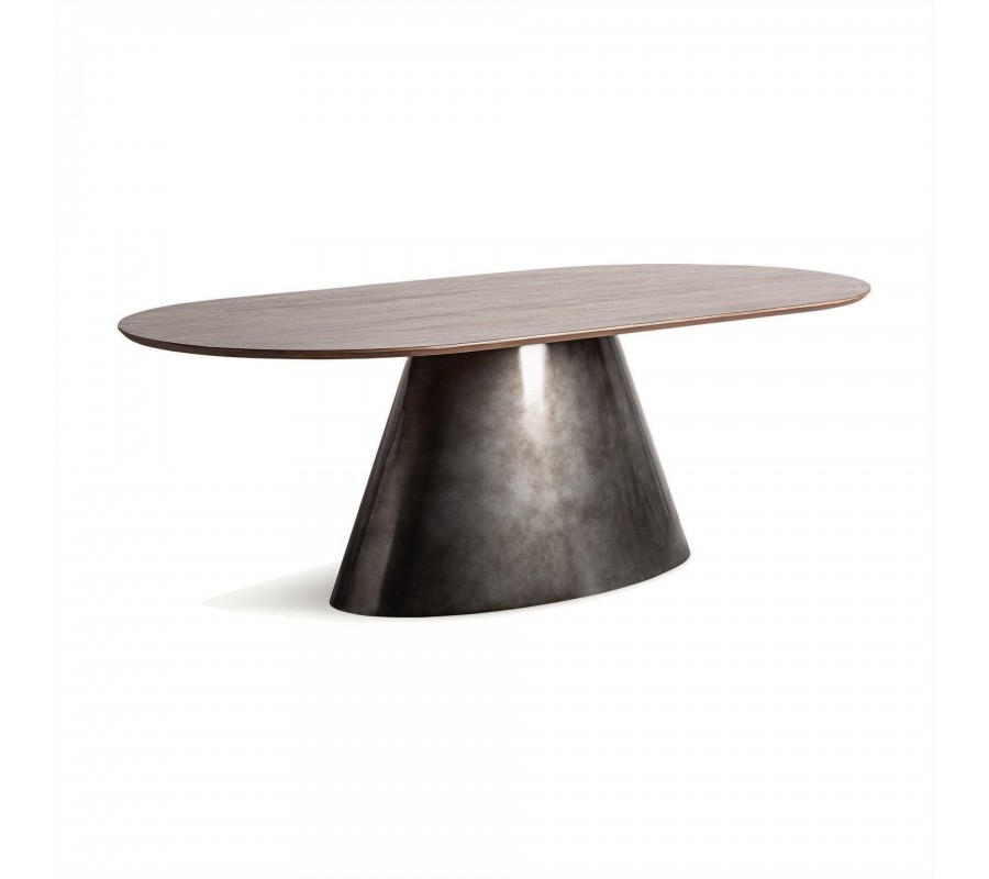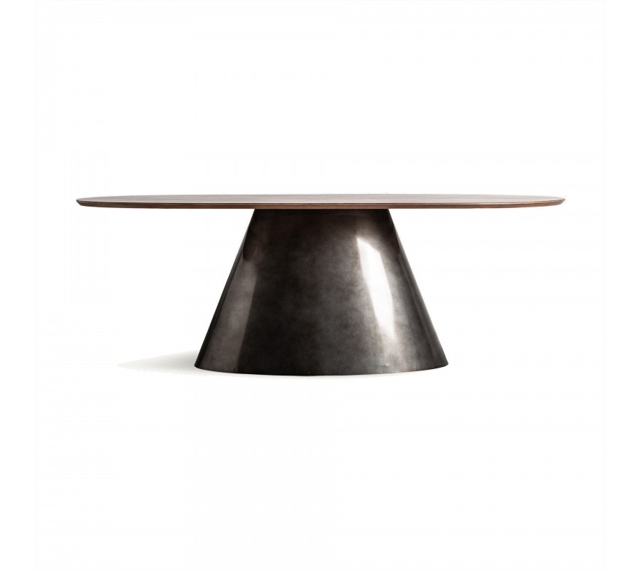 Dominantným prvkom tohto stola je jeho mohutná kužeľovitá noha z kovu v striebornej farbe, ktorá má lesklý, hladký povrch s jemne zrkadlovým efektom. Tento kontrast medzi teplým dreveným odtieňom vrchnej dosky a chladným kovovým základom robí z tohto stola výrazný stredobod každej jedálne alebo luxusného interiéru.