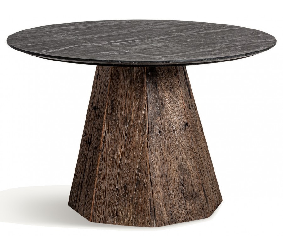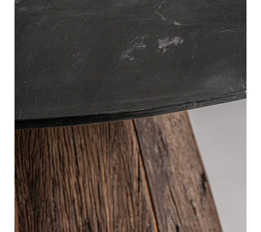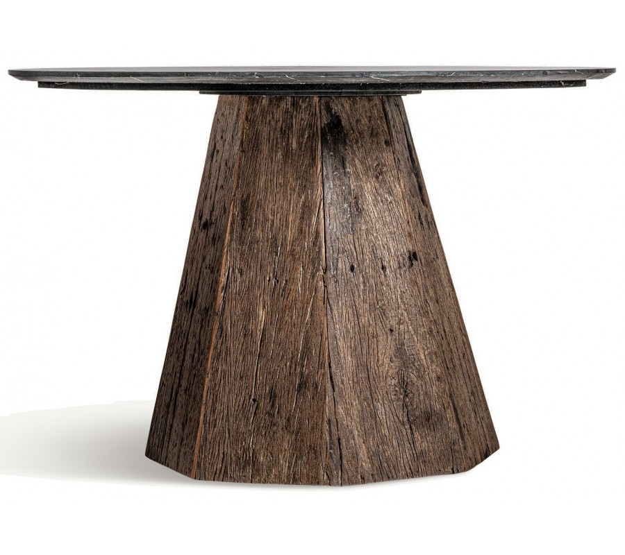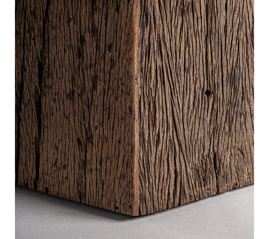 Podstava v tvare osemuholníkového kužeľa je vyrobená z masívneho dreva tmavohnedej farby, ktoré si zachovalo svoju prirodzenú kresbu a hrubú štruktúru. Drevený povrch pôsobí autenticky vďaka jemným vráskam, uzlom, vlásočniciam a drobným nerovnostiam, ktoré sú prirodzeným výsledkom ručného spracovania. Výrazné detaily dodávajú stolu vizuálnu hĺbku a jedinečný charakter.