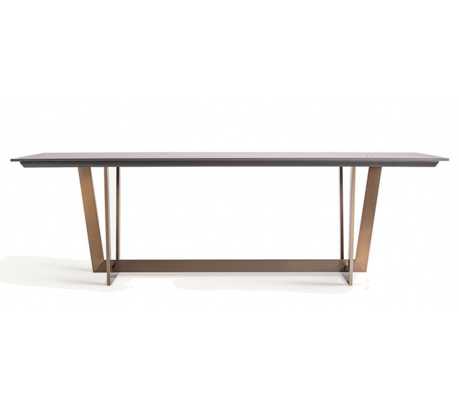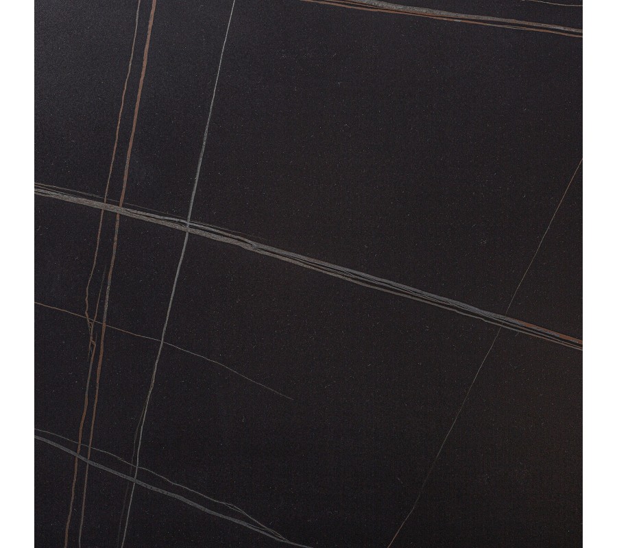 Luxusný glamour jedálenský stôl Brilon zaujme na prvý pohľad vďaka svojej elegantnej vrchnej doske z porcelánu s efektným mramorovým dizajnom v čiernej farbe s bielymi žilkami, ktoré vytvárajú sofistikovaný vizuálny kontrast. Obdĺžnikový tvar a tenký profil dosky dodávajú stolu ľahkosť a moderný výraz.