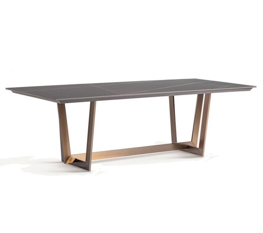 Luxusný art deco obdĺžnikový mramorový jedálenský stôl Brilon s medenými nohami z kovu s porcelánovou čiernou doskou 250 cm