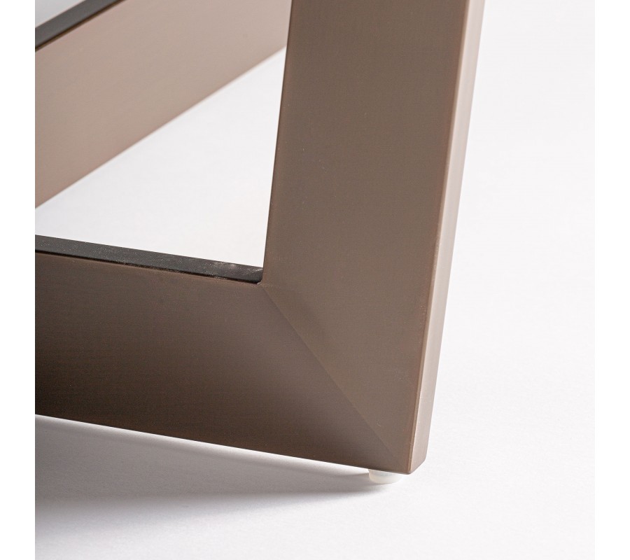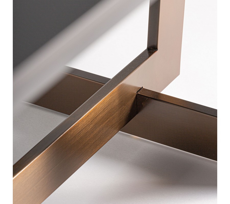 Podnož je vytvorená z kovových nožičiek v medenom odtieni so šikmo usporiadanou geometrickou konštrukciou, ktorá pôsobí architektonicky a zároveň stabilne. Metalický odlesk medenej farby dotvára glamour charakter a podčiarkuje luxusné prevedenie nábytku.