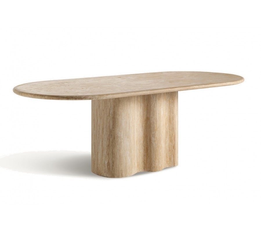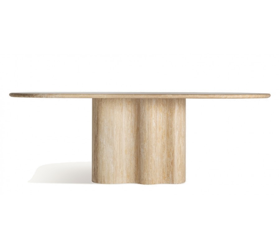 Luxusný jedálenský stôl Lorisa v art deco štýle z prírodného travertínu zaujme svojím oválnym tvarom a impozantnou vlnitou nohou, ktorá je dominantným dizajnovým prvkom. Masívna noha je vytvorená z oblých vertikálnych segmentov, ktoré plynulo prechádzajú jeden do druhého a pripomínajú plastické stĺpy či sochárske spracovanie prírodného materiálu. Tento vlnitý efekt dodáva stolu dynamiku, pričom zároveň zachováva jeho harmonickú symetriu a elegantnú rovnováhu.
