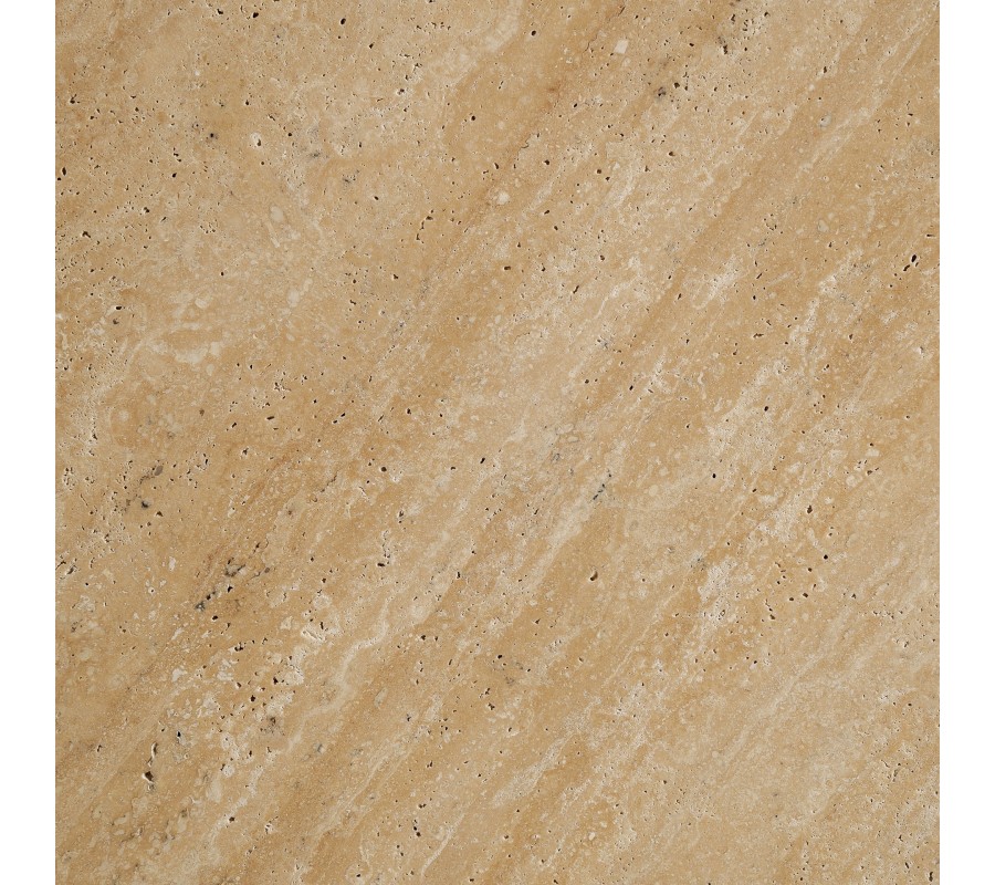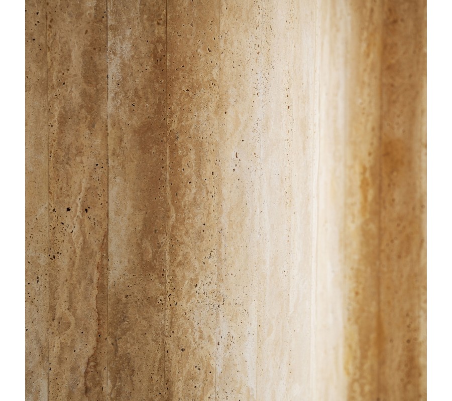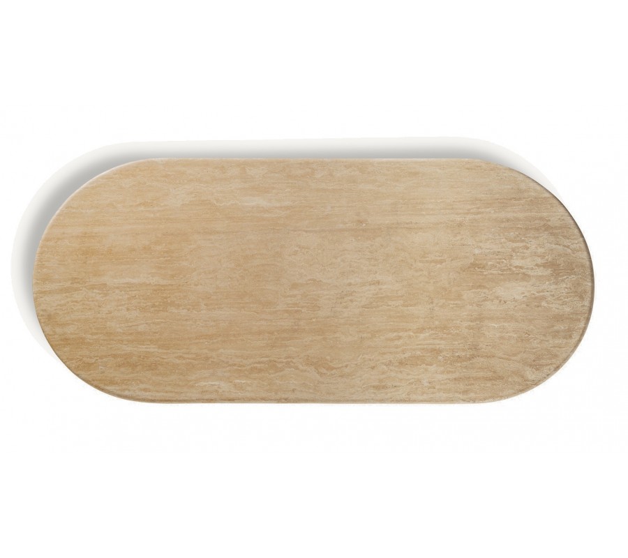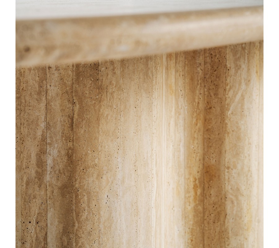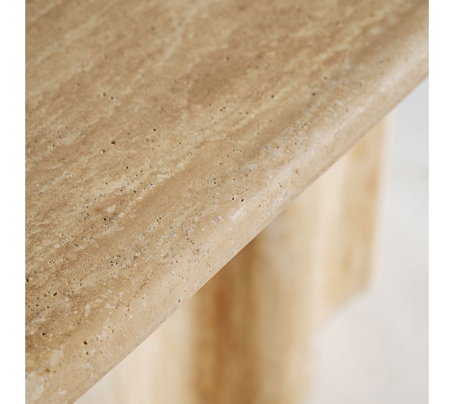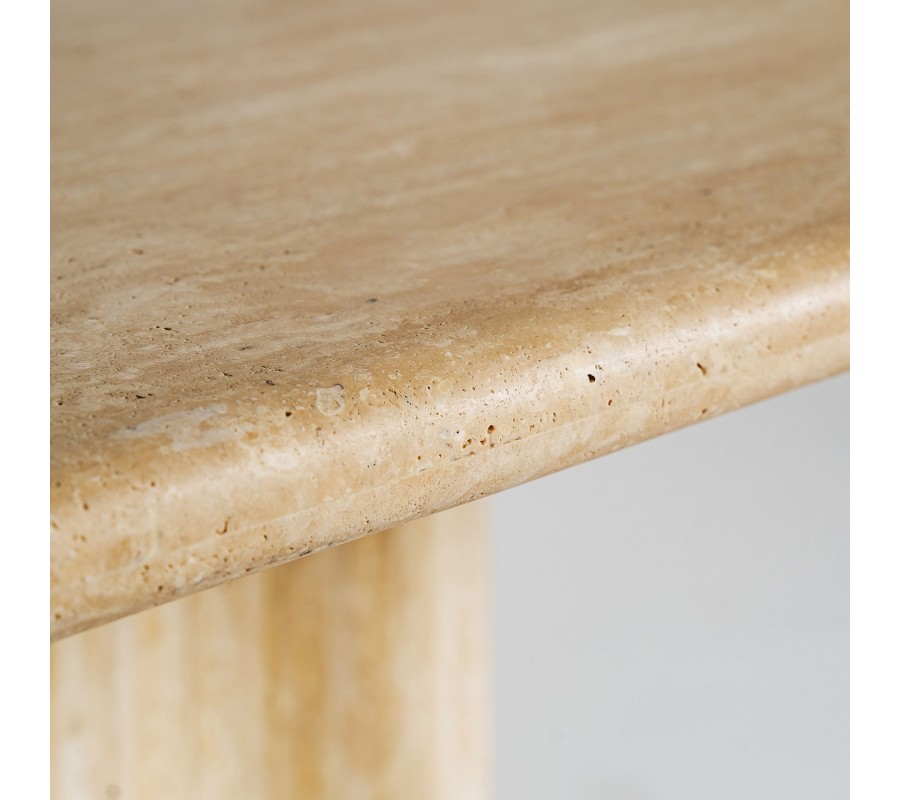 Vrchná doska stola má hladký povrch, na ktorom krásne vyniká prírodná kresba travertínu s jemnými žilkovaniami a farebnými prechodmi od teplých krémových tónov po pieskovo hnedé odtiene. Štruktúra kameňa pridáva na autenticite a exkluzívnosti, pričom každý kus má jedinečný charakter.