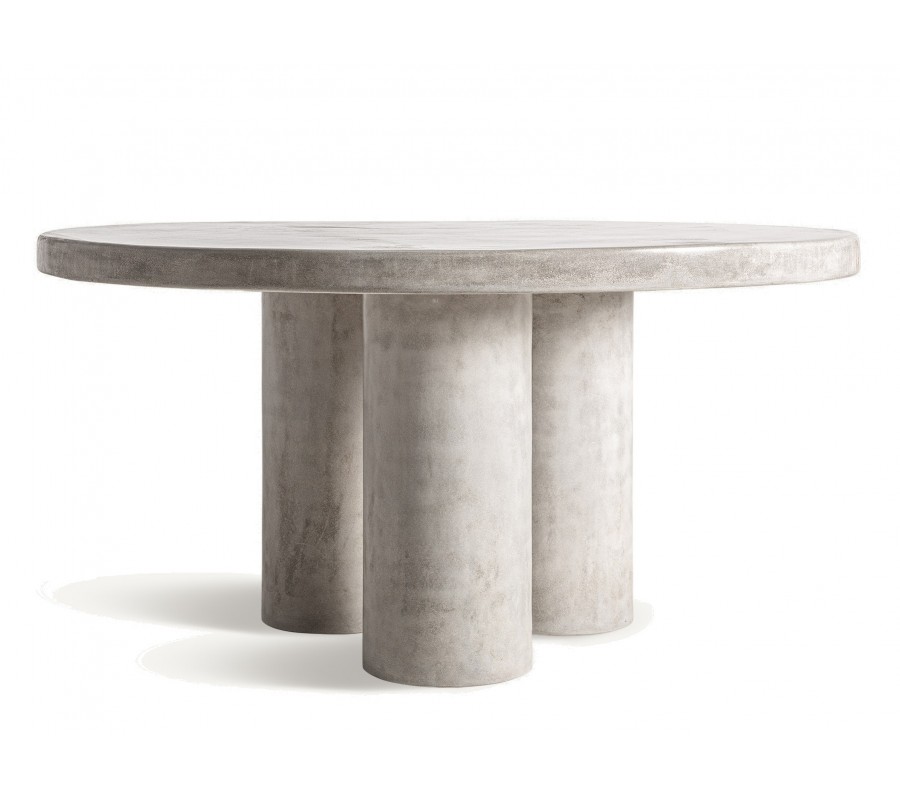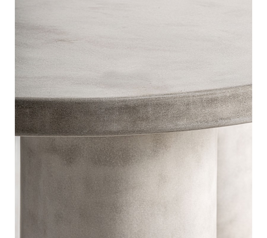Základňa stola je tvorená tromi masívnymi nohami vo valcovom tvare, ktoré sú rovnomerne rozmiestnené a poskytujú konštrukcii potrebnú stabilitu aj výrazný sochársky charakter. Každá noha má identický priemer a výšku, pričom ich valcovitý tvar podčiarkuje symetriu a minimalistickú architektonickú estetiku.