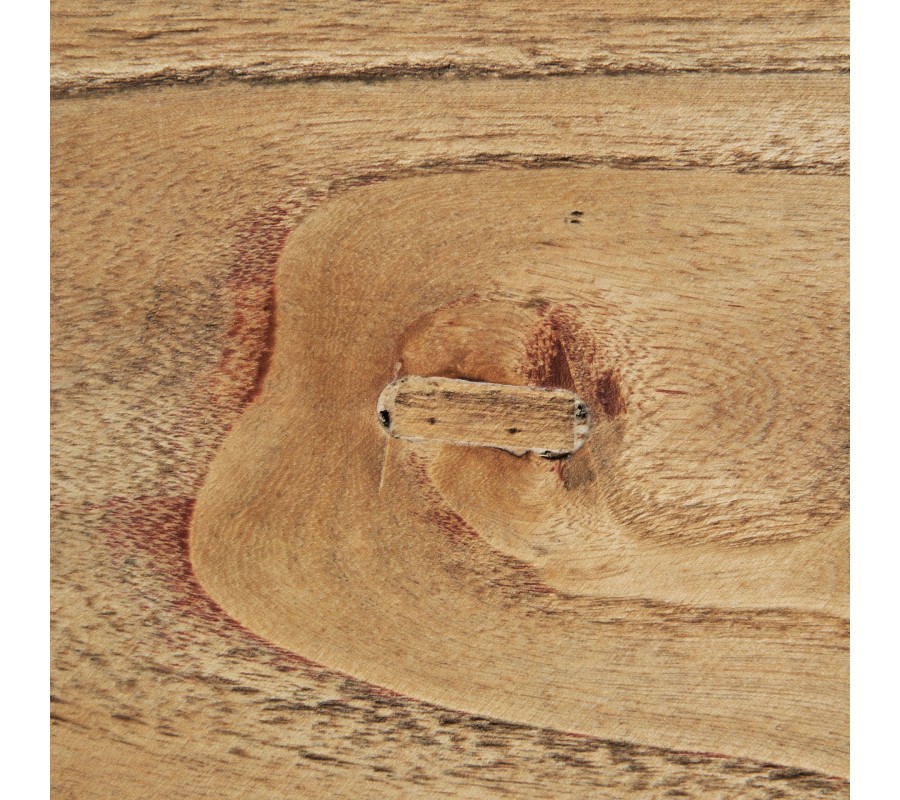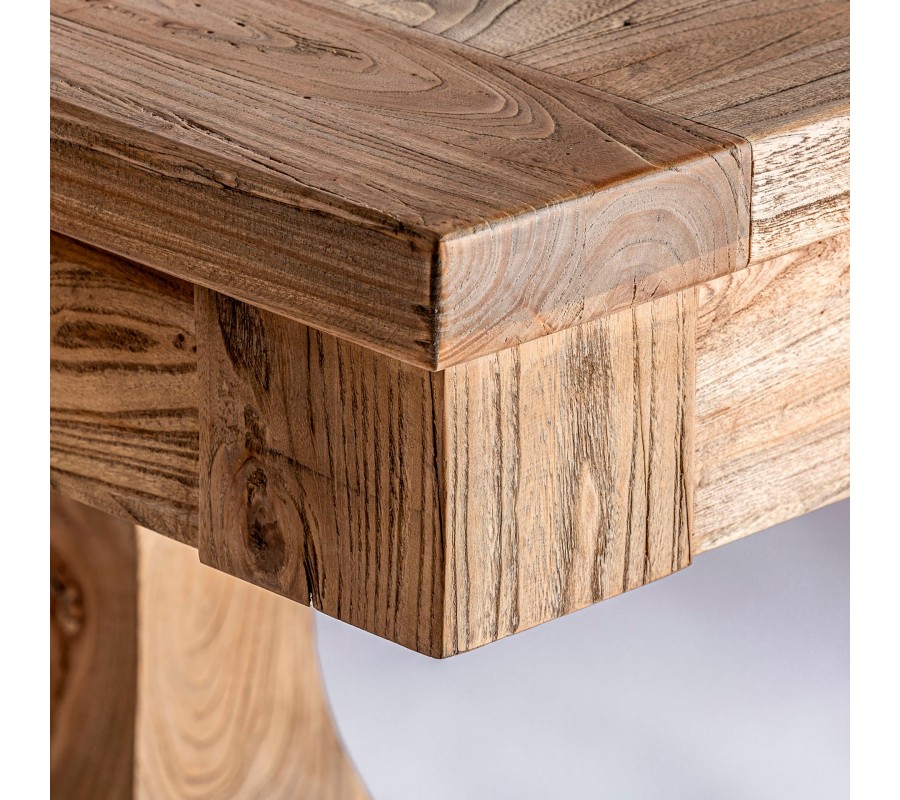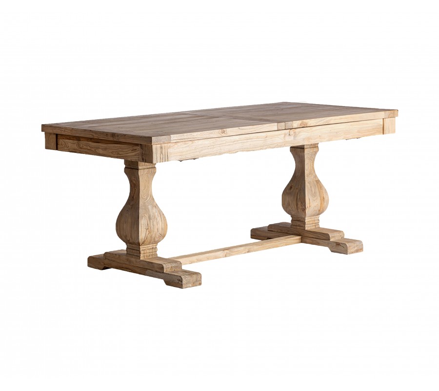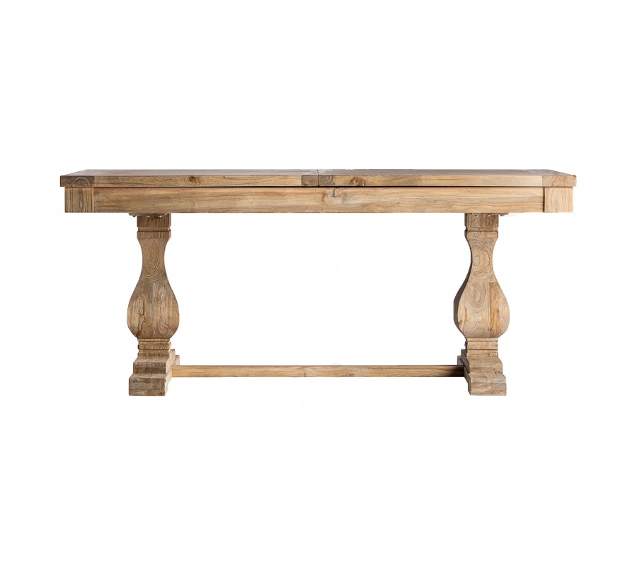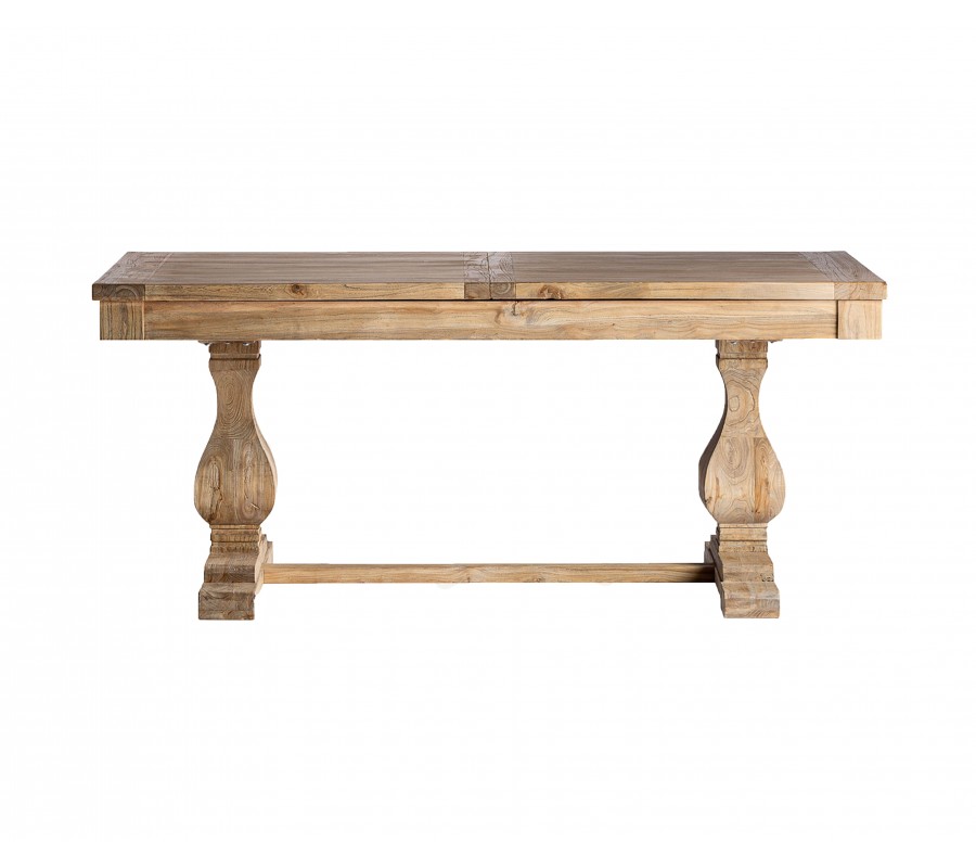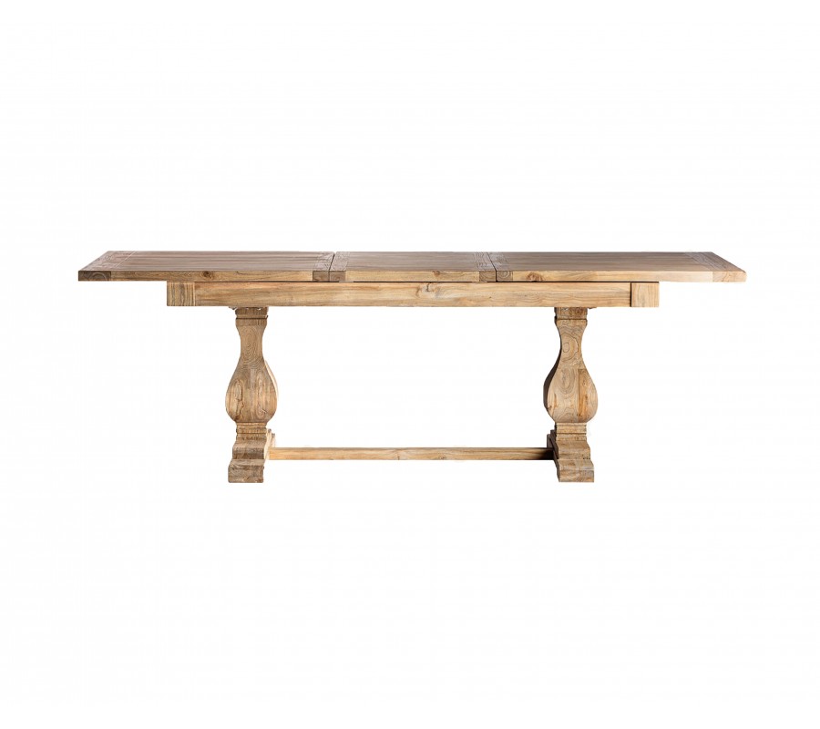 Luxusný koloniálny rozkladací jedálenský stôl Masera je výnimočný kus nábytku v obdĺžnikovom tvare, vyrobený z masívneho brestového dreva v teplej hnedej farbe. Na prvý pohľad zaujme výraznou štruktúrou letokruhov, ktoré dodávajú povrchu stola prirodzený a autentický vzhľad. Vizuálnu dominantu však predstavujú dekoratívne tvarované nožičky, ich mohutný, vyrezávaný tvar pripomína klasické stĺpy, ktoré sú typické pre koloniálny a tradičný nábytok. O stabilitu sa stará vodorovná spojovacia tyč, ktorá spája nožičky a súčasne dotvára symetrickú siluetu stola.