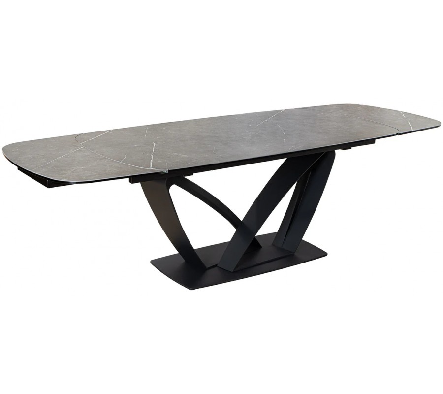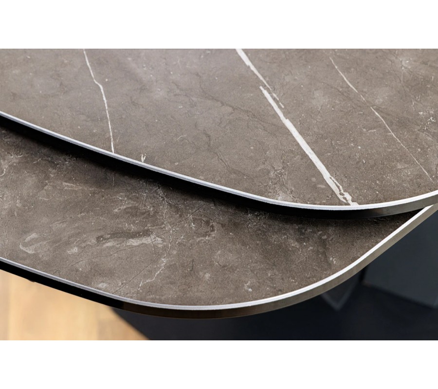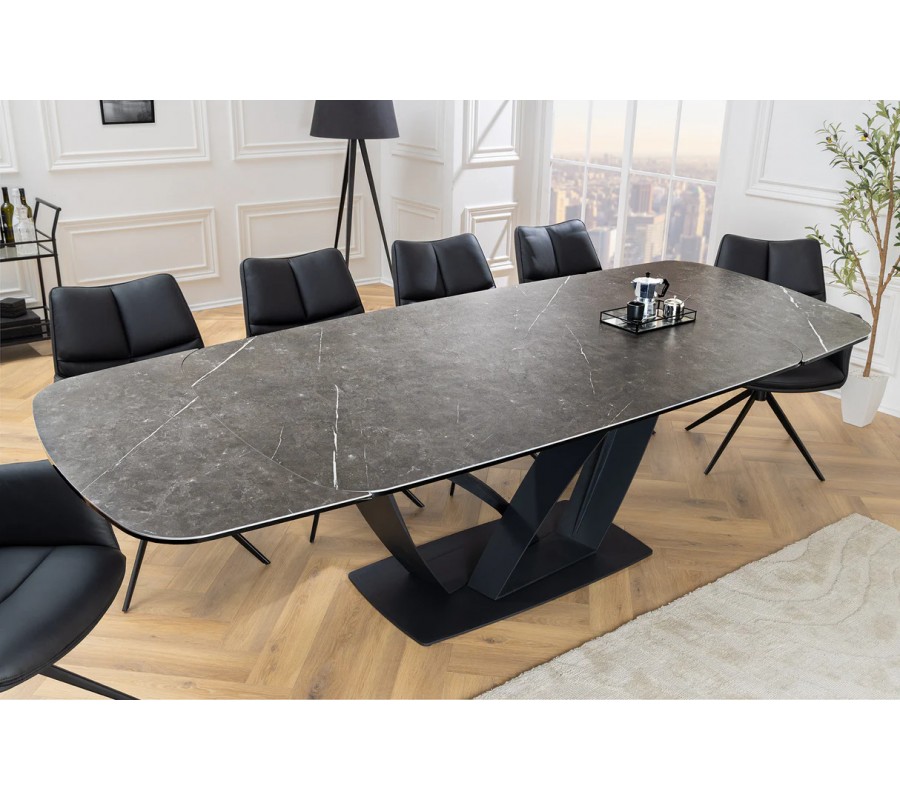 Luxusný rozkladací dizajnový jedálenský stôl Hoal je výrazným kúskom moderného interiéru, ktorý spája elegantný vzhľad s praktickosťou. Jeho čierna obdĺžniková doska s oblými rohmi je vyrobená z keramiky a tvrdeného skla s efektným mramorovým dekorom, ktorý dodáva stolu sofistikovaný vzhľad a zároveň je vysoko odolný voči poškodeniu, teplu a vlhkosti.