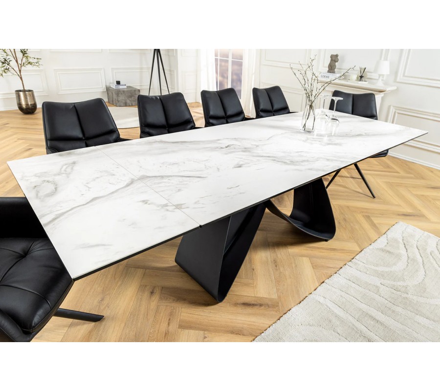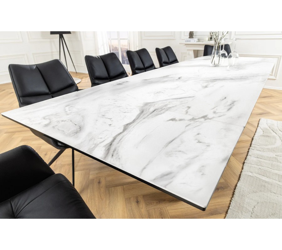 Luxusný rozkladací mramorový jedálenský stôl Hoal v bielej farbe so sivými žilkami a čiernymi kovovými nožičkami 260 cm