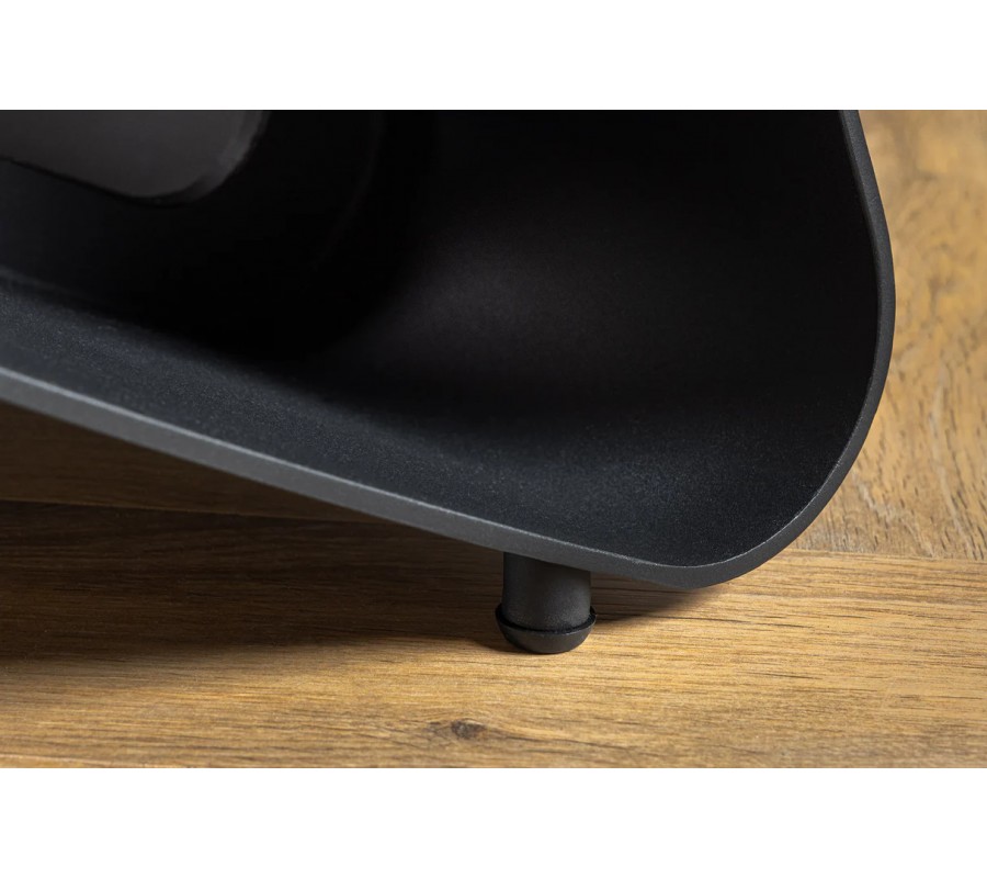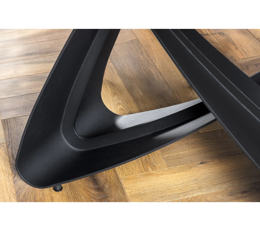 Nohy stola sú vyrobené z kovu v čiernej farbe s matným povrchom a majú dynamický oblý tvar, ktorý sa prekrižuje v strede, čím vytvárajú pôsobivý sochársky dojem.