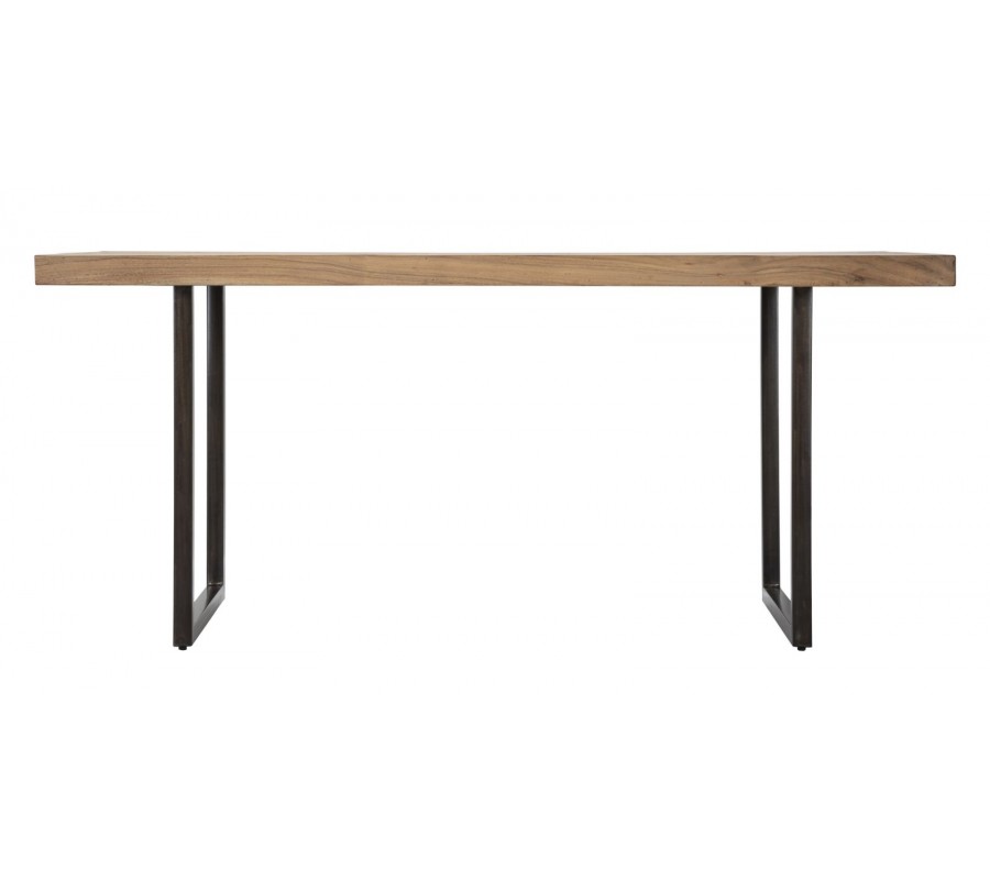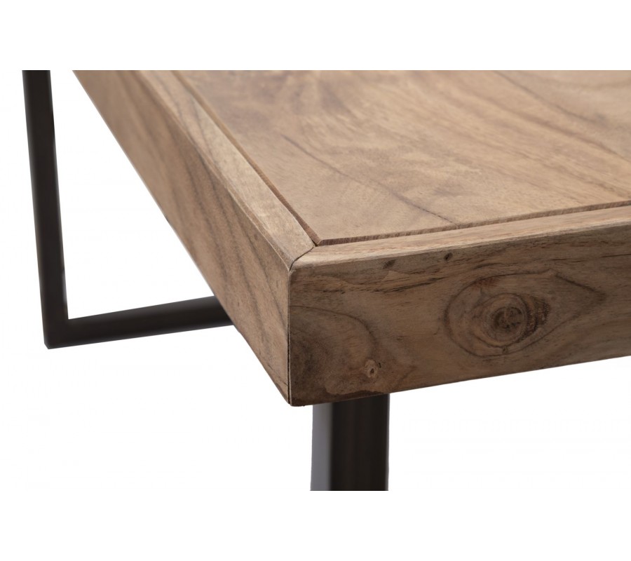 Jedálenský stôl má modernú siluetu, s obdĺžnikovou vrchnou doskou a dvomi nohami v tvare U. Nohy sú vyrobené z kovu v čiernej farbe a dodávajú nábytku nádych industriálneho štýlu. Vrchná doska je vyrobená z akáciového dreva v príjemnej svetlej hnedej farbe, ktorá prinesie do priestoru pocit tepla. Jemná kresba letokruhov zdôrazňuje naturálny charakter materiálu.
