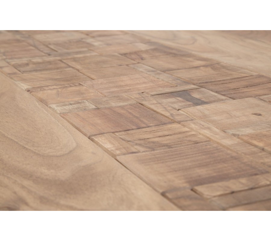 Stredom vrchnej dosky prechádza pás s dekoratívnou drevenou mozaikou. Je asymetricky vyložená štvorcovými a obdĺžnikovými kusmi, ktoré vytvárajú moderný geometrický dizajn, pripomínajúci kubistické dielo. Jej povrch je len jemne členitý, takže vás neobmedzuje pri používaní stola.