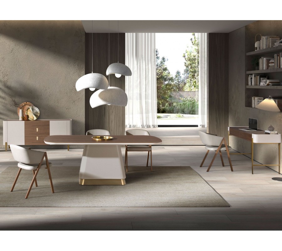 Stôl je vyrobený z kvalitného dyhovaného dreva a jeho silueta spája moderné rovné línie a hladké povrchy s elegantnými zakriveniami. Vrchná doska má obdĺžnikový tvar s výrazne zaoblenými rohmi. Je vyrobená z orechového dreva v naturálnom hnedom odtieni. Kresba letokruhov plynie paralelne s dlhšími hranami stola a vizuálne ho predĺži. Obvod vrchnej dosky má svetlé béžové lakovanie, ktoré ju vizuálne prepája s podstavou.