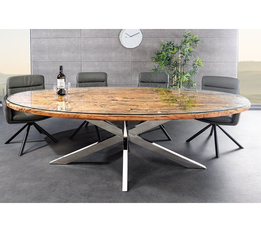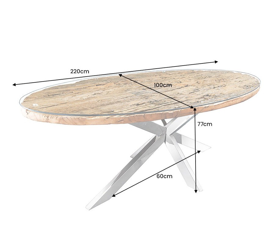Moderný industriálny oválny jedálenský stôl Barracuda s doskou z masívneho teakového dreva a chrómovou kovovou podstavou 220 cm