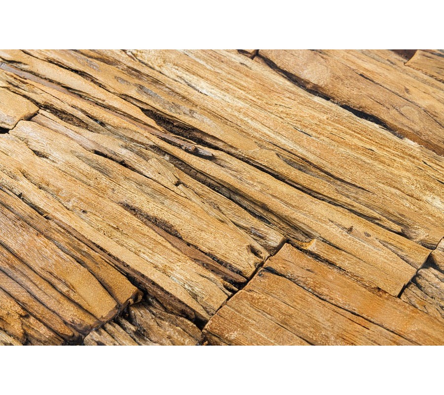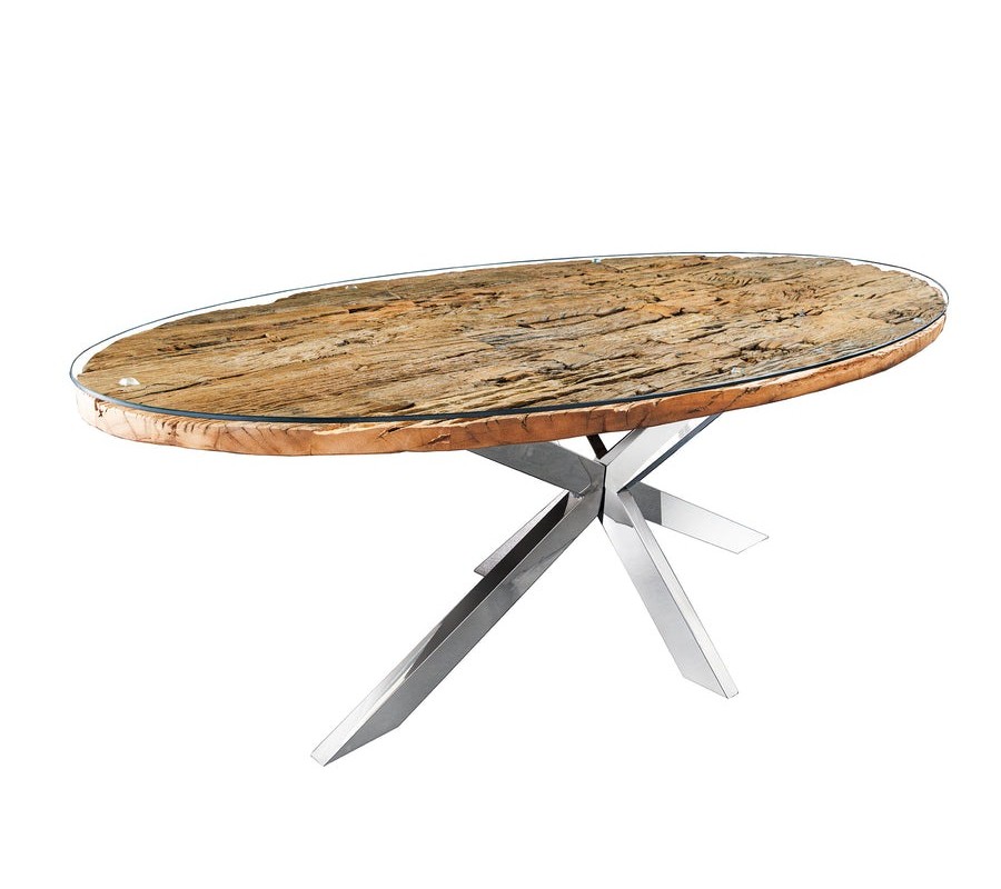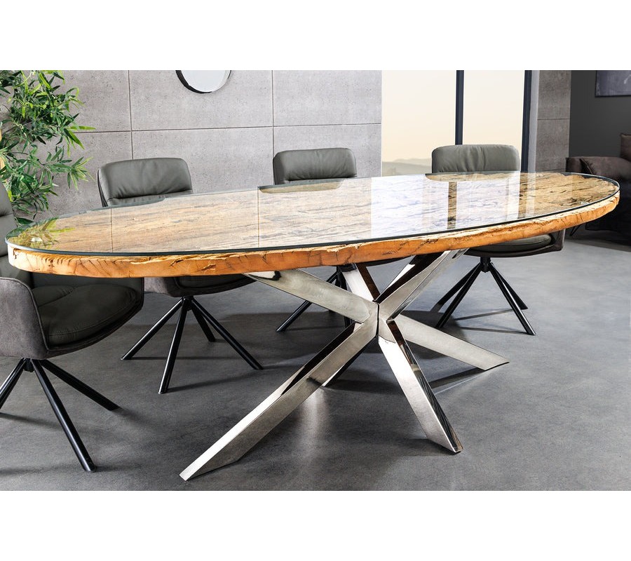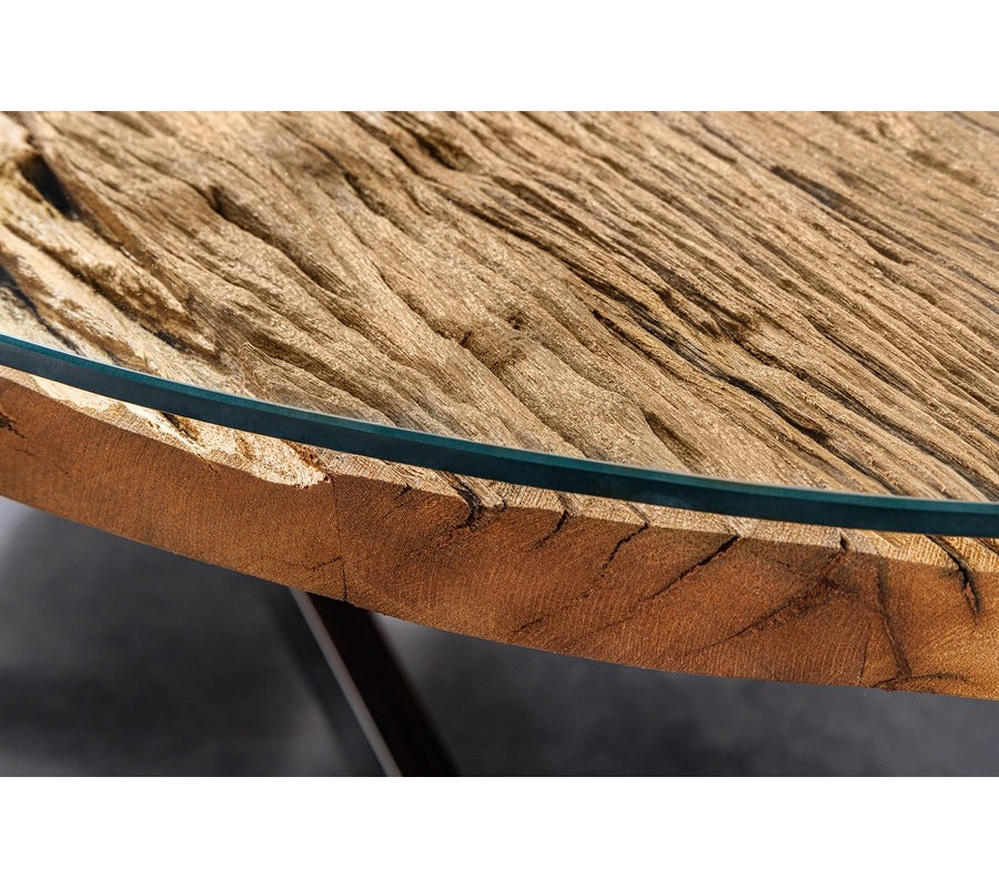 Jedálenský stôl Barracuda predstavuje kombináciu modernej estetiky s naturálnym šarmom masívneho dreva. Jeho oválna vrchná doska je vyrobená z teakového dreva v prírodnom hnedom odtieni, pričom si zachováva výraznú štruktúru s autentickými prasklinami a nerovnosťami, ktoré sú chránené vrstvou tvrdeného, priehľadného, kvalitného, odolného skla. Tým vzniká harmonický kontrast medzi prírodou a industriálnou eleganciou.