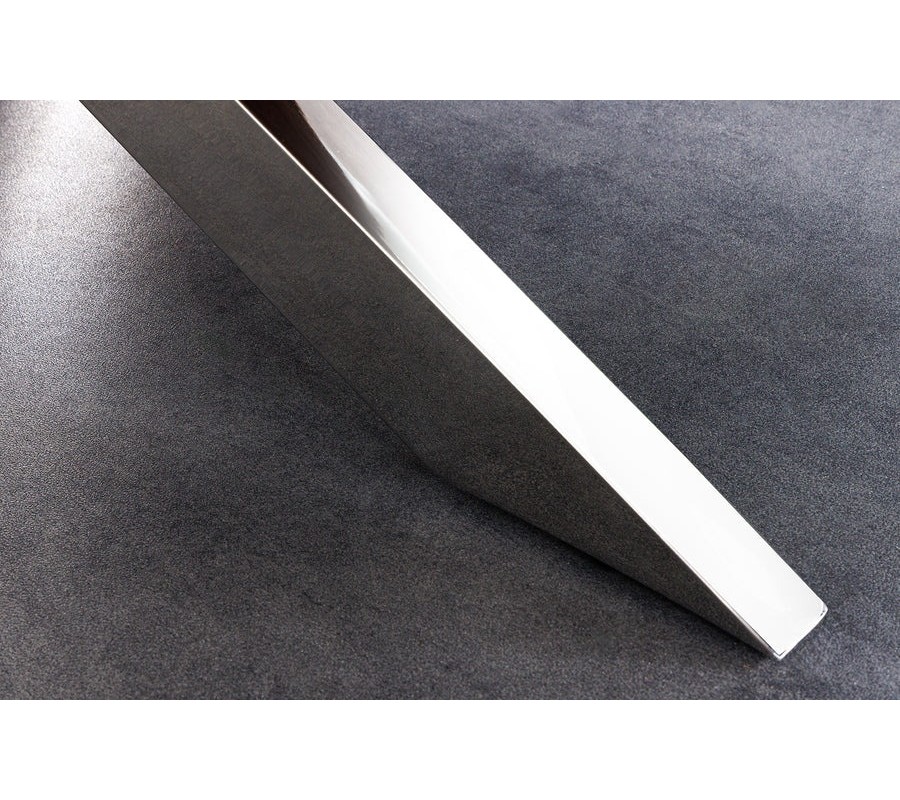 Podstava stola je navrhnutá ako dvojité X z lesklého chrómovaného kovu, kde sú kratšie nožičky umiestnené priečne a dlhšie nožičky pozdĺžne, čím vytvárajú dynamický a stabilný stredový kríž. Táto konštrukcia dodáva stolu vzdušný a zároveň sochársky charakter.