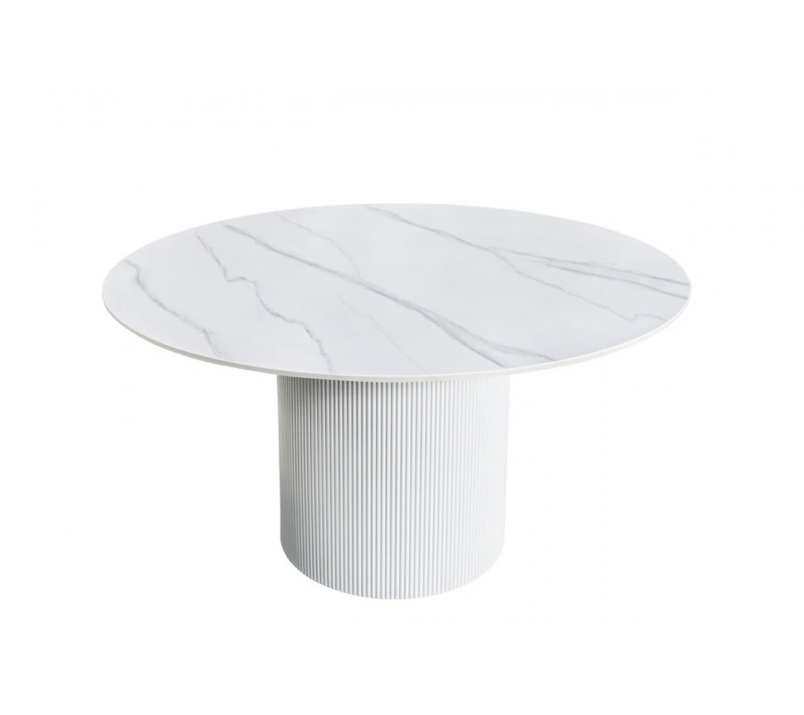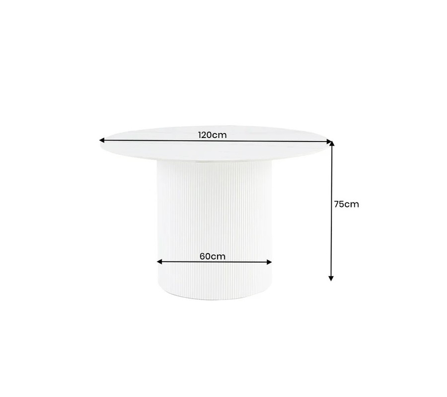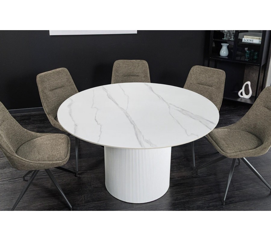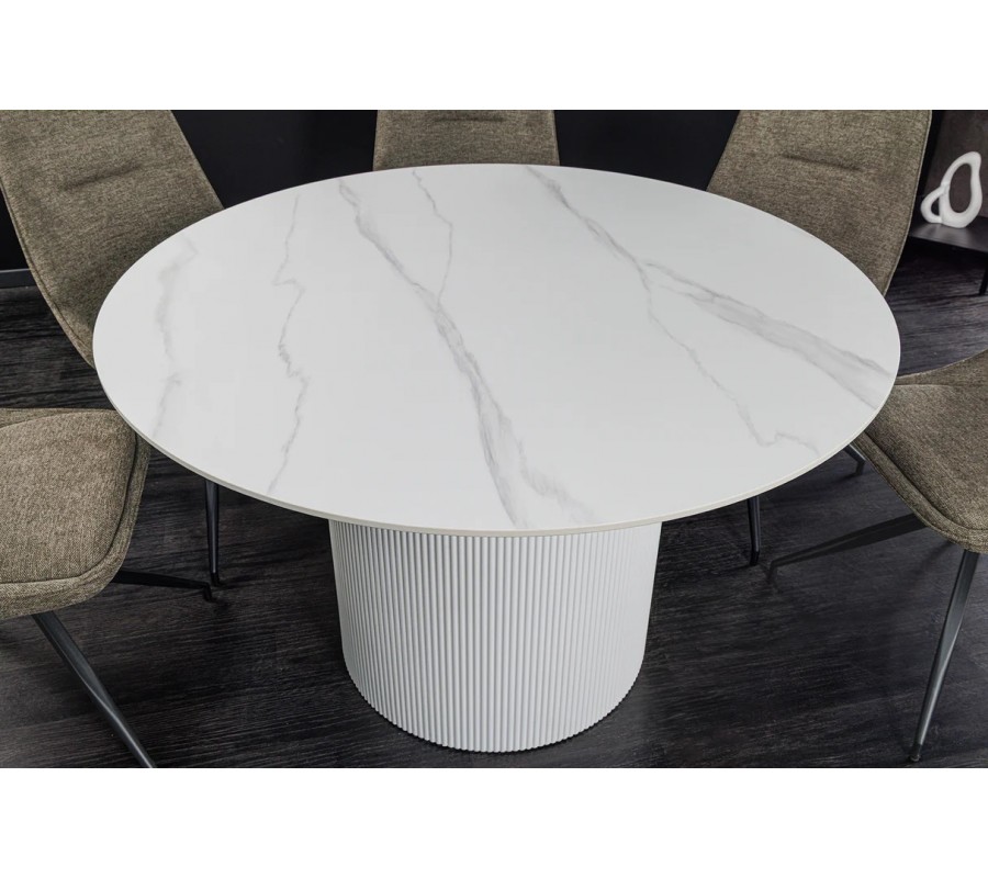 Art deco okrúhly jedálenský stôl Marmol Lignia s bielou drážkovanou podstavou a mramorovou bielou doskou 120 cm