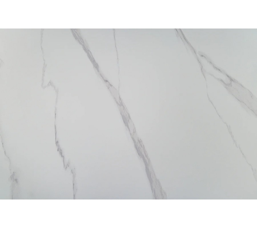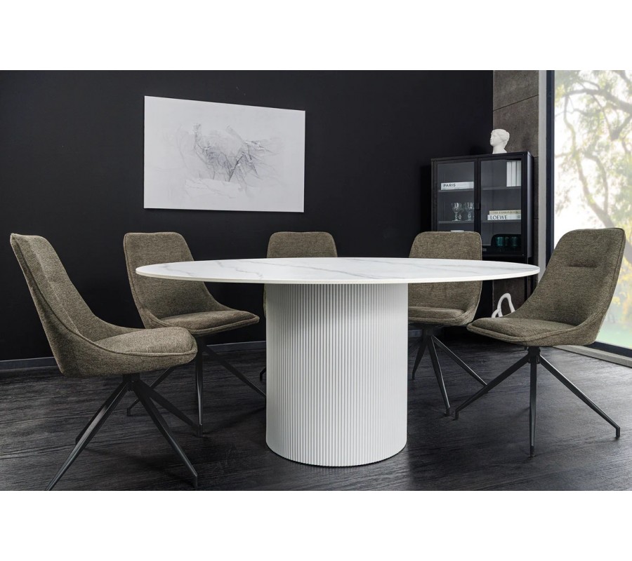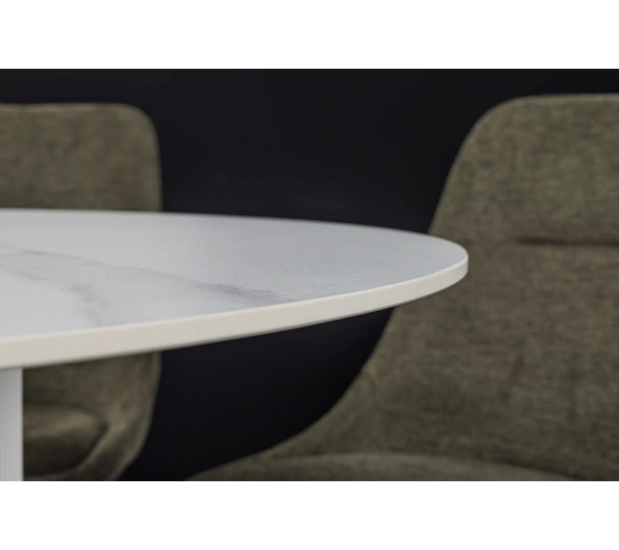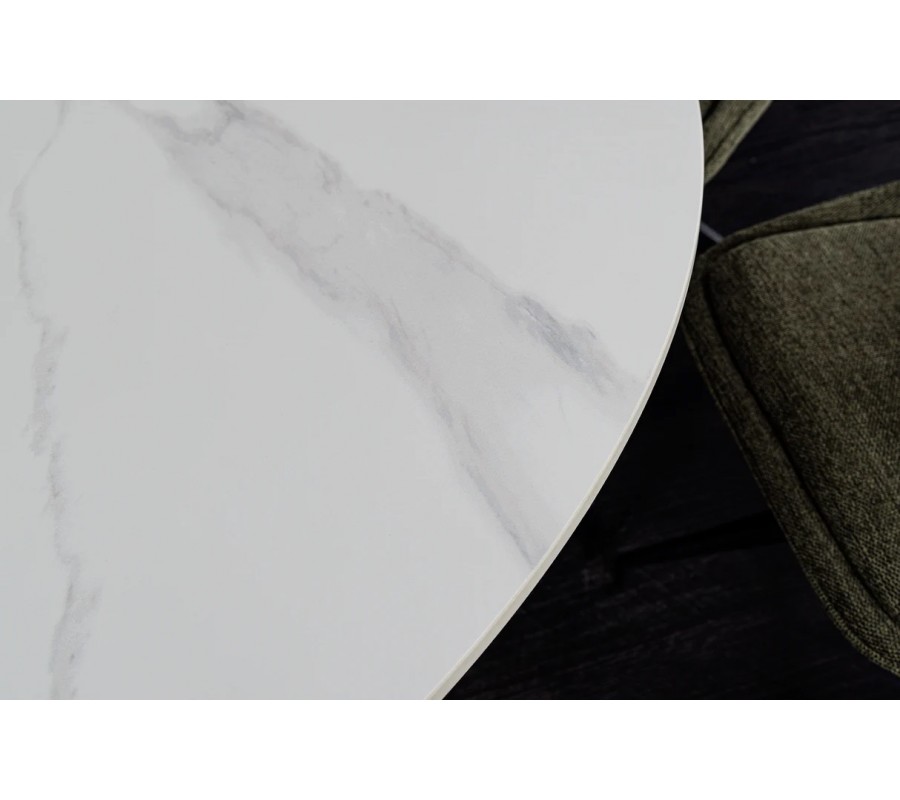 Jedálenský stôl Marmol Lignia v tejto elegantnej verzii zaujme svetlou farebnou kompozíciou s okrúhlou keramickou doskou v bielom prevedení. Jemné sivé mramorové žilkovanie dodáva povrchu nadčasový vzhľad prírodného kameňa. Matný povrch pôsobí sofistikovane a prispieva k harmonickej atmosfére v interiéri.