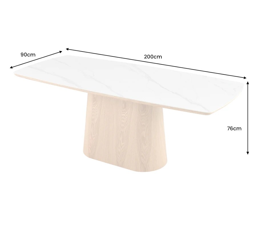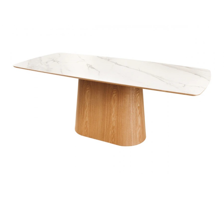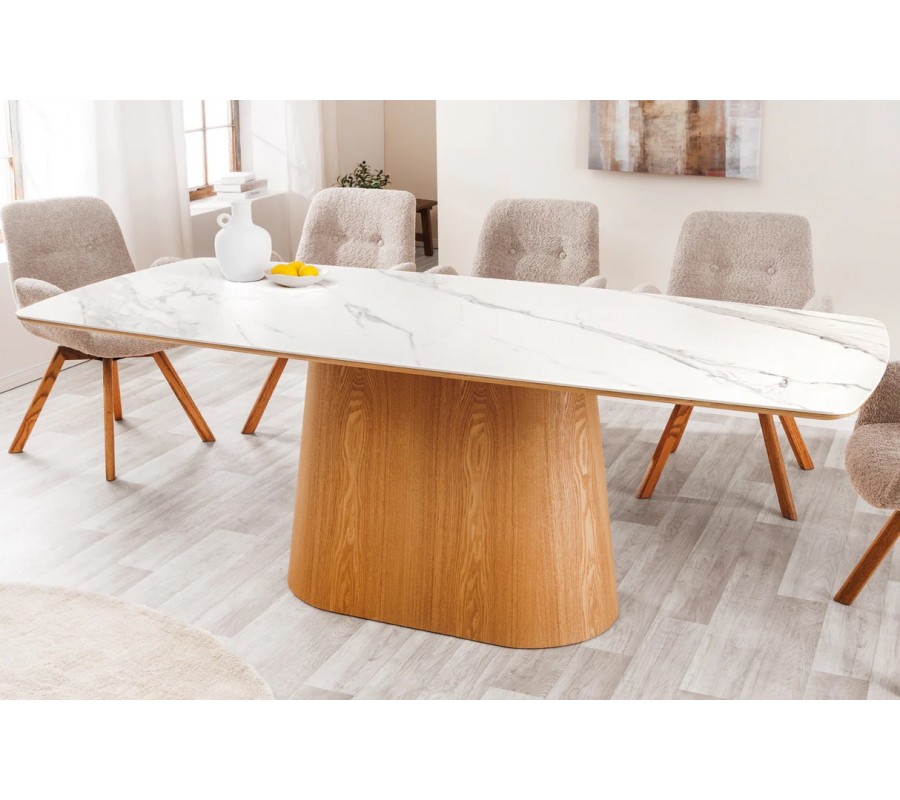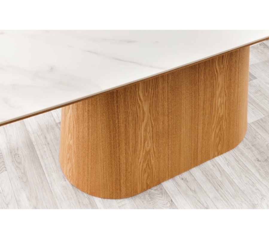 Luxusný obdĺžnikový art deco jedálenský stôl Marmol Lignia s hnedou podstavou s dubovým dizajnom a bielou doskou 200 cm