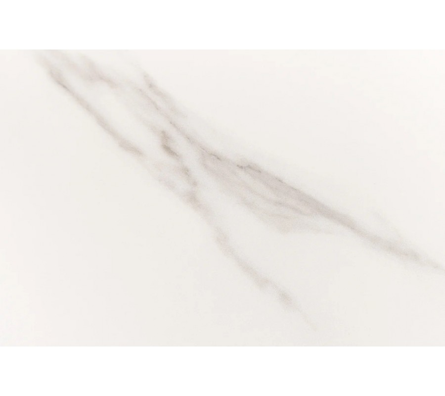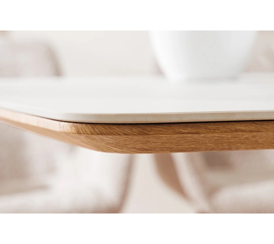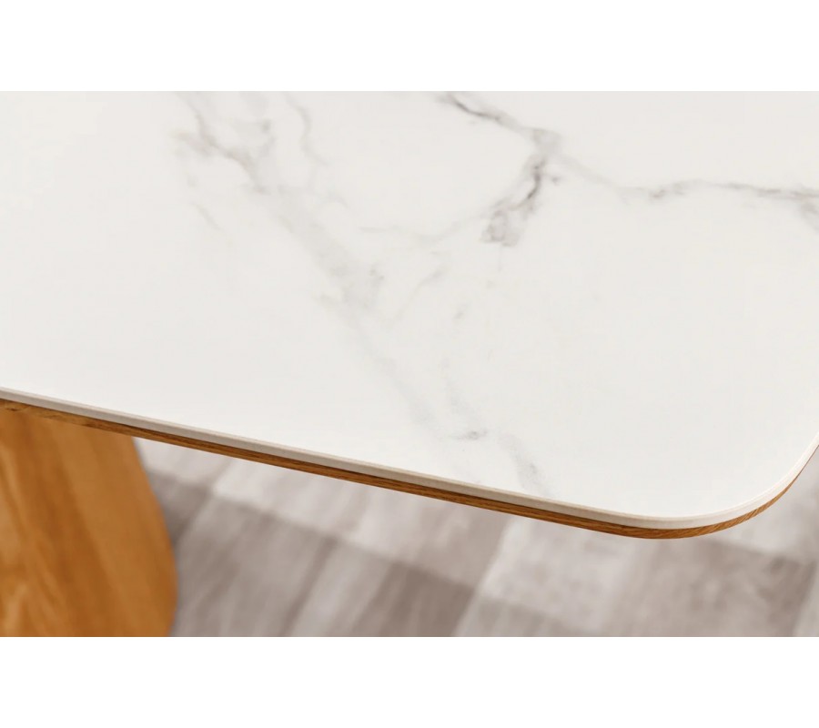 Jedálenský stôl Marmol Lignia v obdĺžnikovej verzii zaujme kombináciou elegantného art deco dizajnu a prírodne pôsobiacich materiálov. Vrchná doska z keramiky v bielej farbe s jemným svetlosivým mramorovým žilkovaním má zaoblené rohy, ktoré zjemňujú celkový vizuál. Keramický povrch má matný efekt a pôsobí dojmom pravého prírodného kameňa.