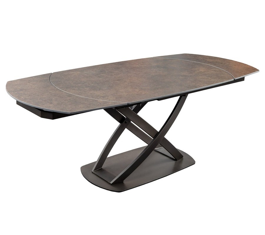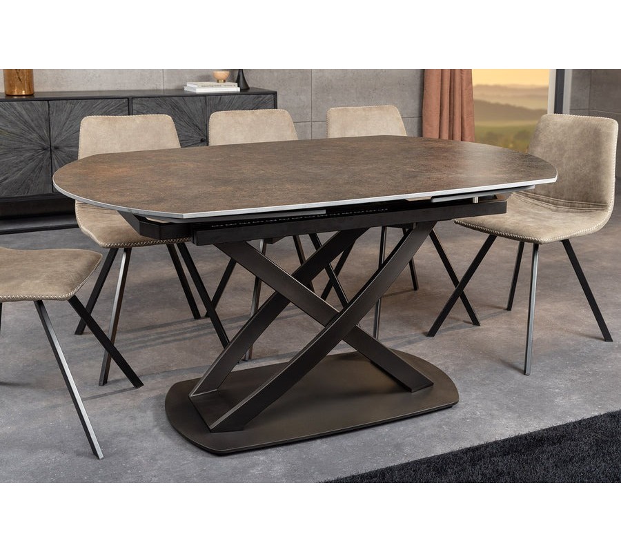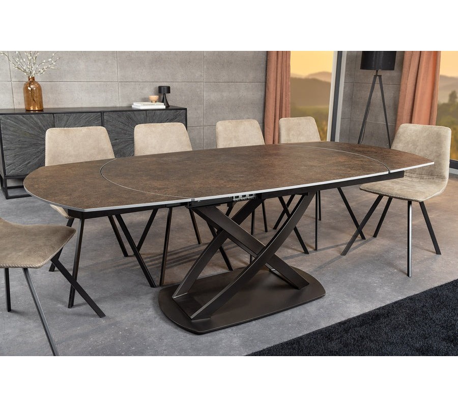 Moderný oválny rozkladací stôl Lutz s keramickou doskou v hrdzavej hnedej farbe a kovovou prekríženou podstavou 190 cm
