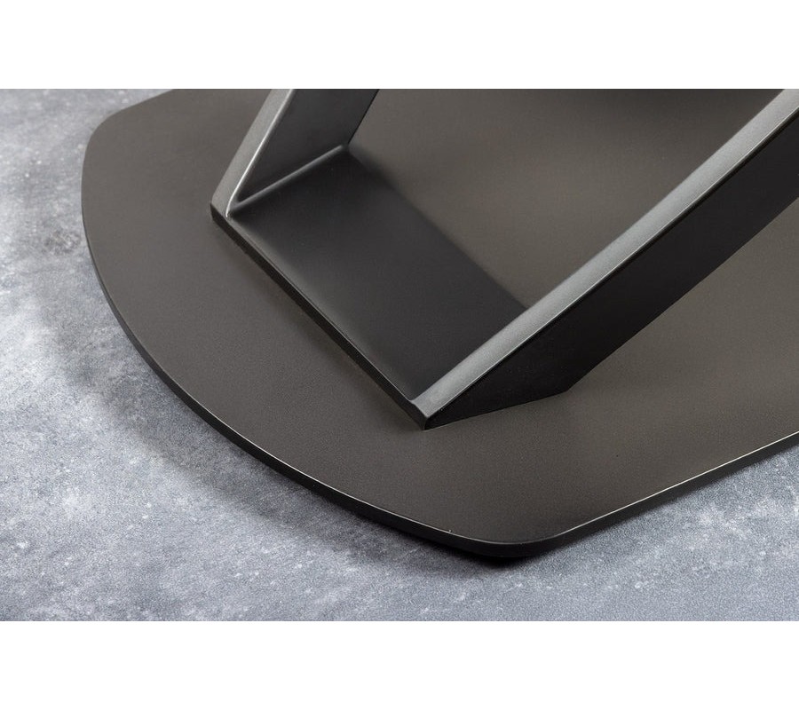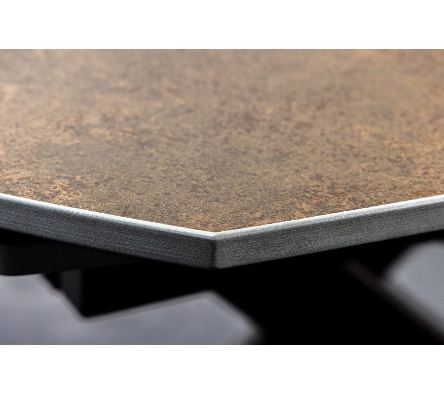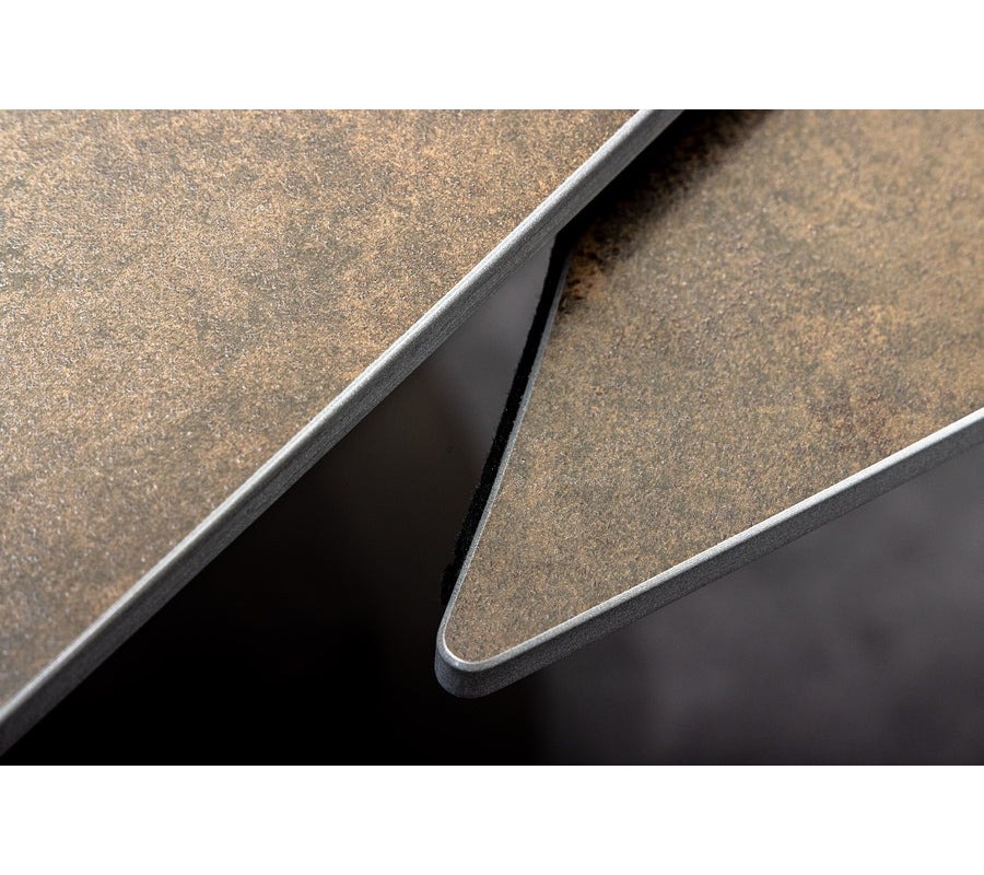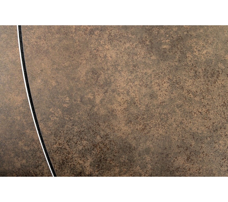 Jedálenský stôl Lutz zaujme originálnou farebnosťou a moderným dizajnom, ktorý prepája praktickosť s estetickou výraznosťou. Jeho oválna keramická doska má povrch s hrdzavo hnedým dekorom pripomínajúcim patinovaný kameň, ktorý pôsobí hrejivo, sofistikovane a zároveň moderne. Keramika je odolná voči vysokým teplotám, poškriabaniu aj bežnému opotrebovaniu, a je preto ideálnou voľbou pre každodenné stolovanie.