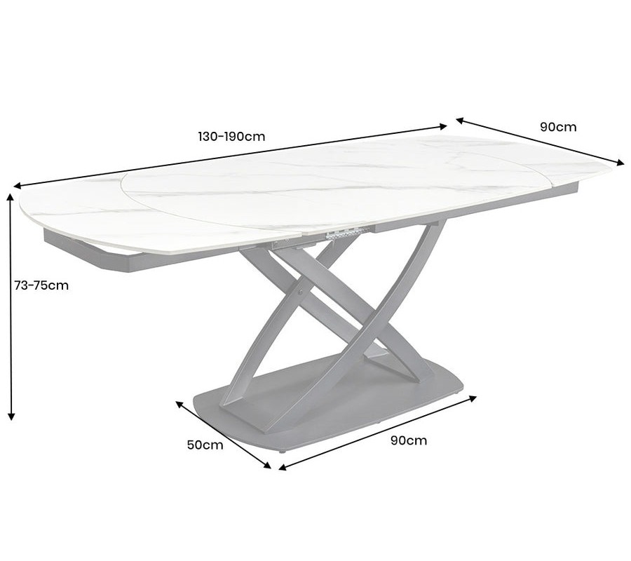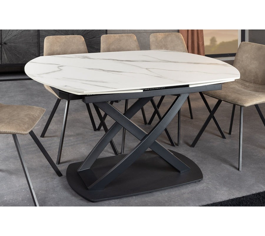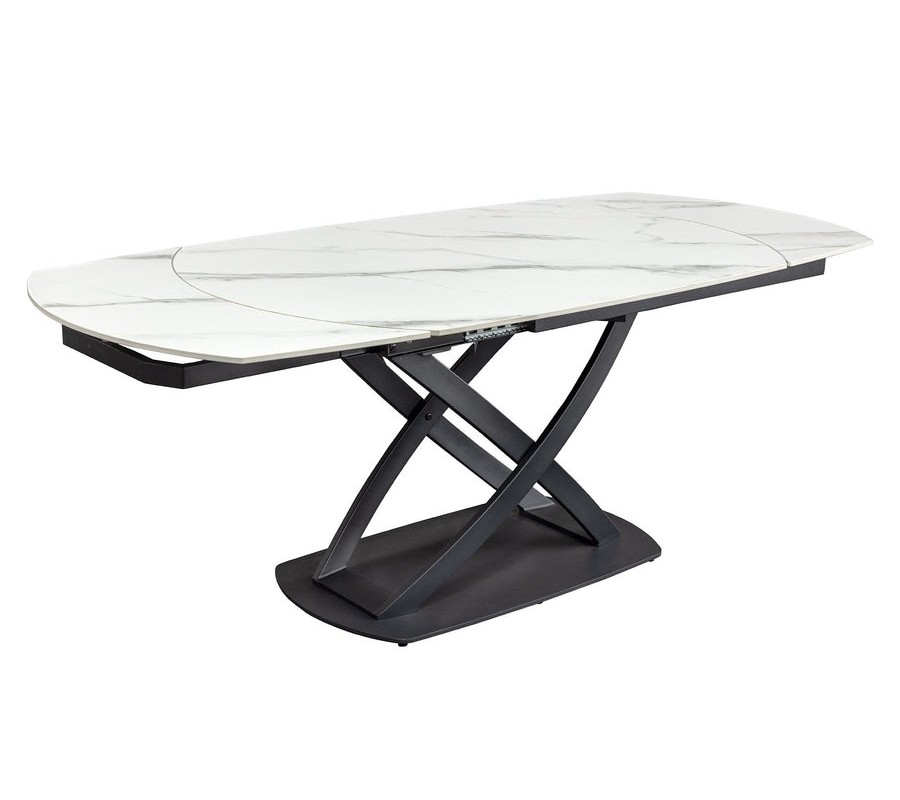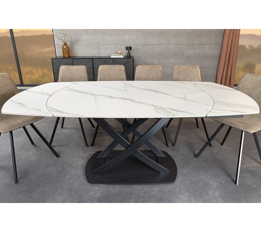 Moderný biely oválny keramický rozkladací jedálenský stôl Lutz s mramorovým vzhľadom a čiernou kovovou podstavou 190 cm