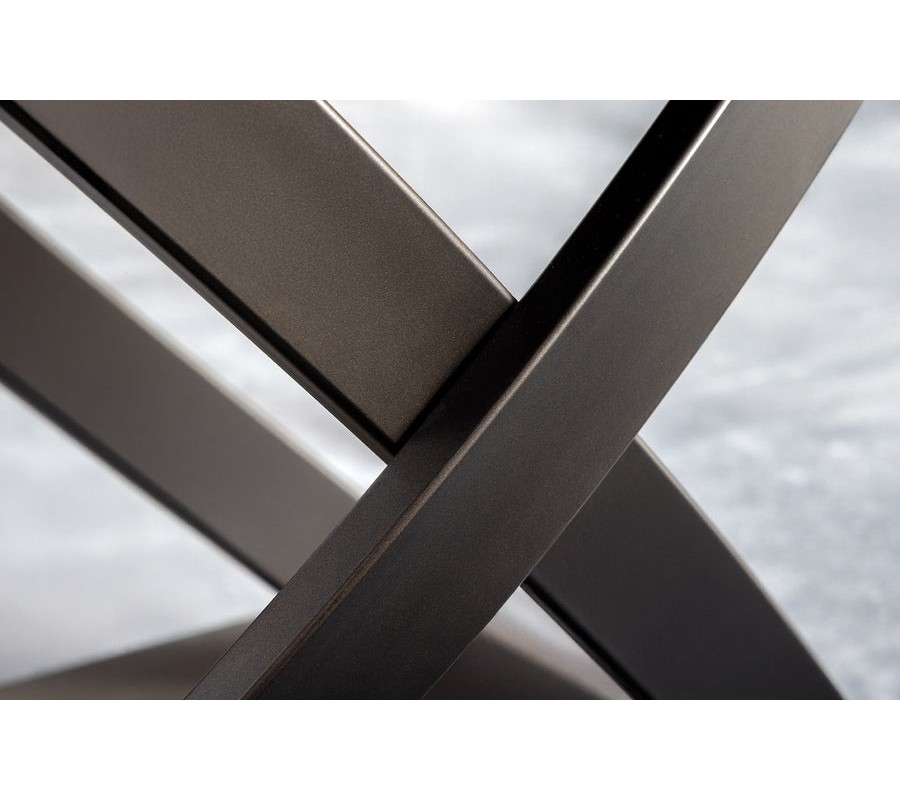 Čierna kovová podstava je tvorená štyrmi prekríženými tyčami, ktoré vytvárajú dynamickú konštrukciu s pevnou obdĺžnikovou základňou so zaoblenými rohmi. Táto stabilná konštrukcia harmonicky kontrastuje s bielym povrchom a dodáva stolu výrazný dizajnový charakter.