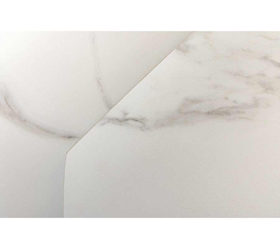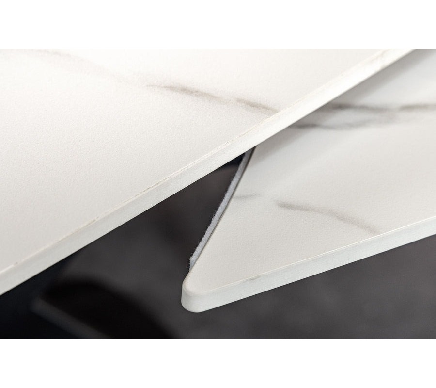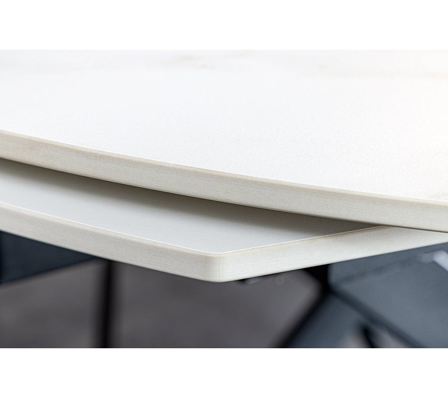 Jedálenský stôl Lutz v elegantnom modernom štýle zaujme výraznou bielou keramickou doskou so sivými mramorovými žilkami, ktorá pôsobí vzdušne, luxusne a nadčasovo. Keramický povrch dodáva nielen štýl, ale aj vysokú odolnosť voči teplu, poškriabaniu a škvrnám, čo oceníte pri každodennom používaní.