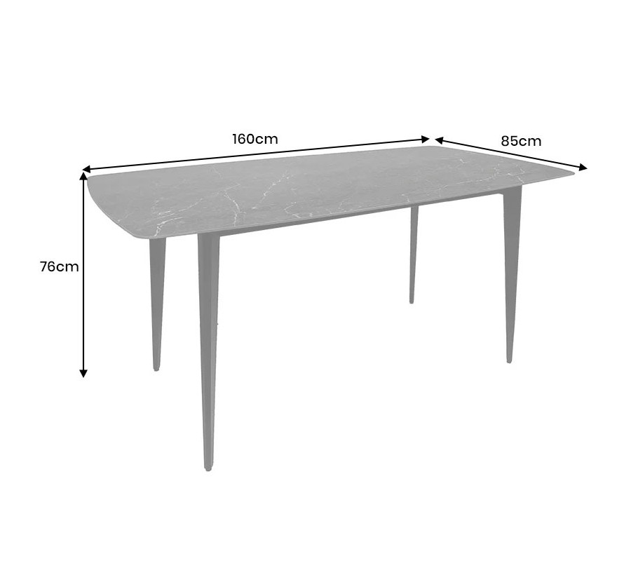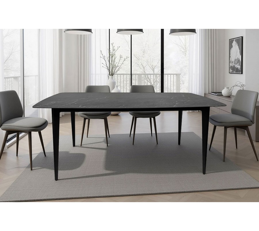 Vrchná doska obdĺžnikového tvaru, s jemne zaoblenými rohmi je vyrobená z keramiky v čiernej farbe s jemným bielym mramorovým vzorom, ktorý pridáva stolu luxusný a nadčasový vzhľad. Keramický povrch pôsobí luxusne, no zároveň je vysoko odolný a jednoduchý na údržbu.