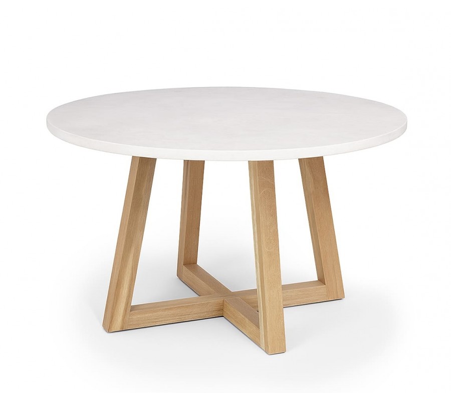 Luxusný moderný okrúhly jedálenský stôl Zoia s bielou vrchnou doskou z mikrocementu a hnedou drevenou podstavou 140 cm