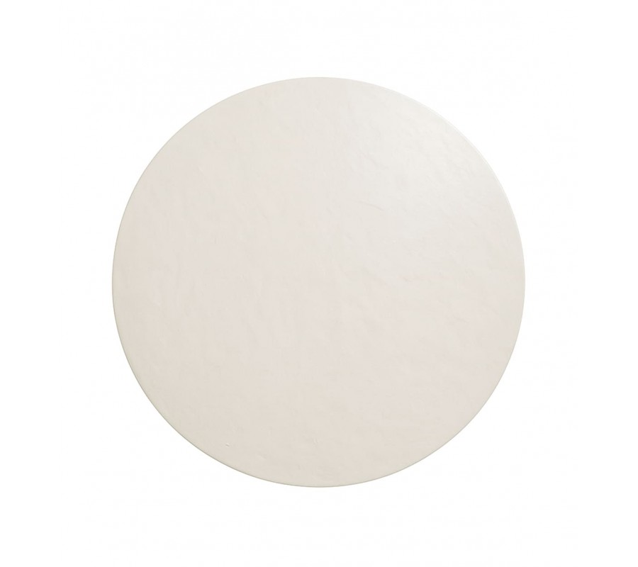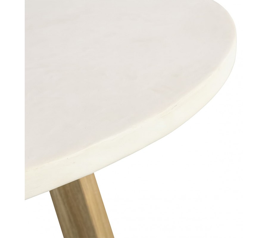 Vrchná doska je vyrobená z mikrocementu v bielej farbe. Tento materiál poskytuje hladký a na údržbu nenáročný povrch, je vodovzdorný a zároveň má jemnú štruktúru, vďaka čomu je obľúbenou voľbou pri výrobe nábytku v modernom štýle. Podstava je vyrobená z masívneho mangového dreva vo svetlej hnedej farbe s jemnou kresbou letokruhov a svojím teplým vizuálom vyvažuje betónový charakter vrchnej dosky.