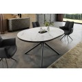 Čierne kovové nožičky v prekríženom dizajne vytvárajú pevnú a zároveň vizuálne odľahčenú základňu, ktorá podporuje moderný a architektonický výraz stola. Ich rozostup zabezpečuje dostatok priestoru pre nohy zo všetkých strán.