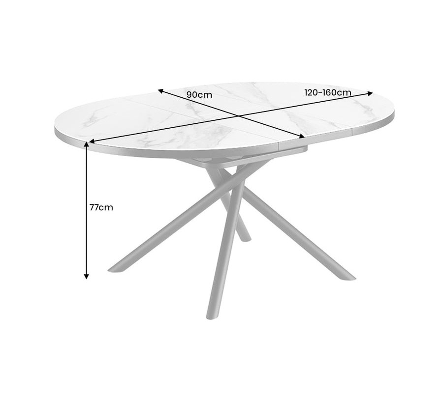 V základnej podobe má stôl okrúhly tvar s priemerom 120 cm, kde sa pohodlne usadí 4 až 5 osôb. Pomocou mechanizmu sa rozkladá do dĺžky 160 cm, čím sa mení na oválny tvar vhodný pre 6 až 8 osôb.