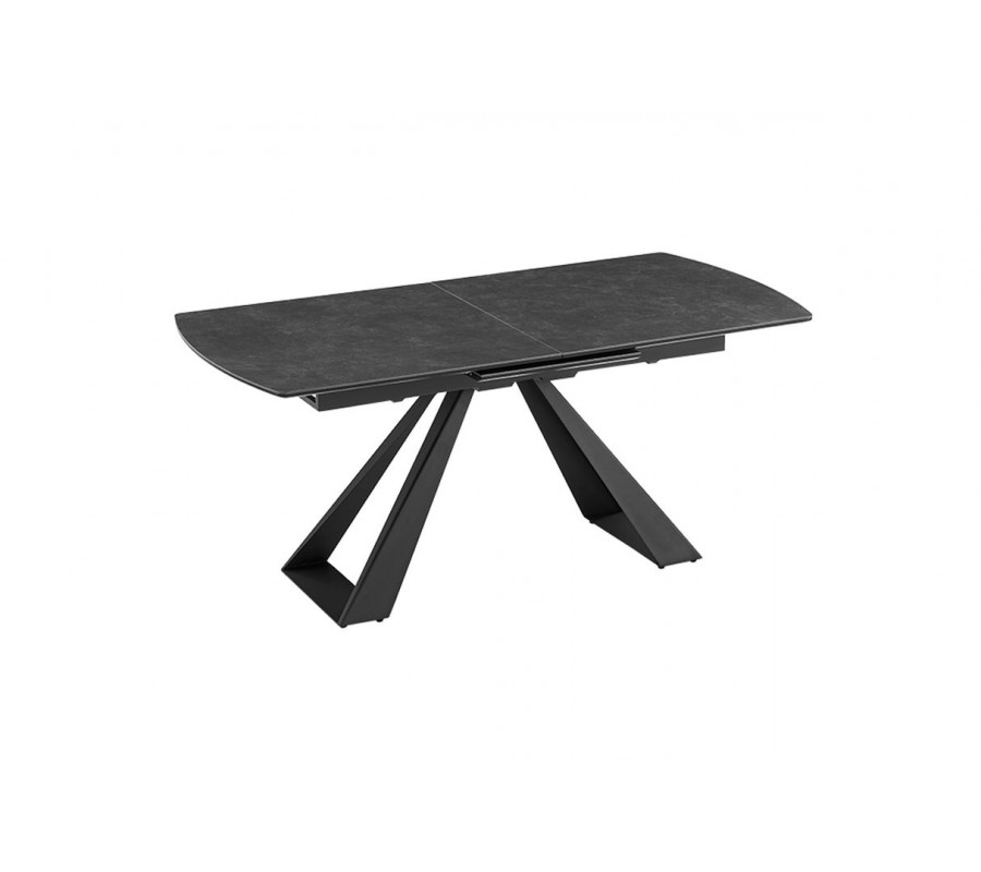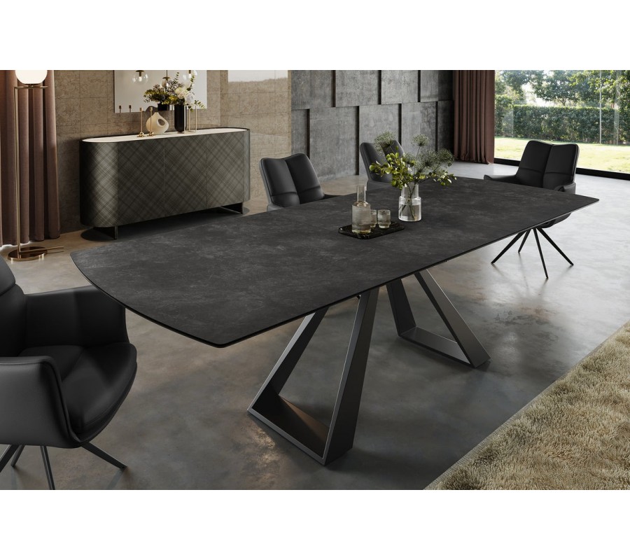 Výrazným vizuálnym prvkom sú čierne kovové nožičky s atypickým trojuholníkovým profilom – v spodnej časti sú širšie a smerom nahor sa zužujú. Táto konštrukcia dodáva stolu architektonický charakter a zaisťuje jeho stabilitu aj pri väčšom zaťažení.