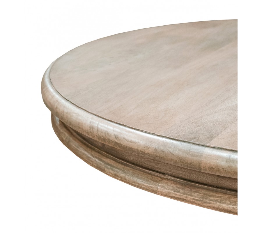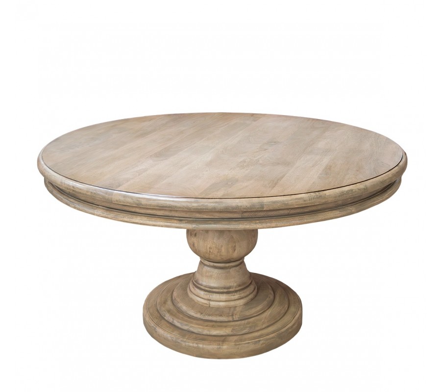 Luxusný vintage okrúhly jedálenský stôl Trinidad v svetlej hnedej farbe s patinou a okrúhlou vyrezávanou nohou 140 cm
