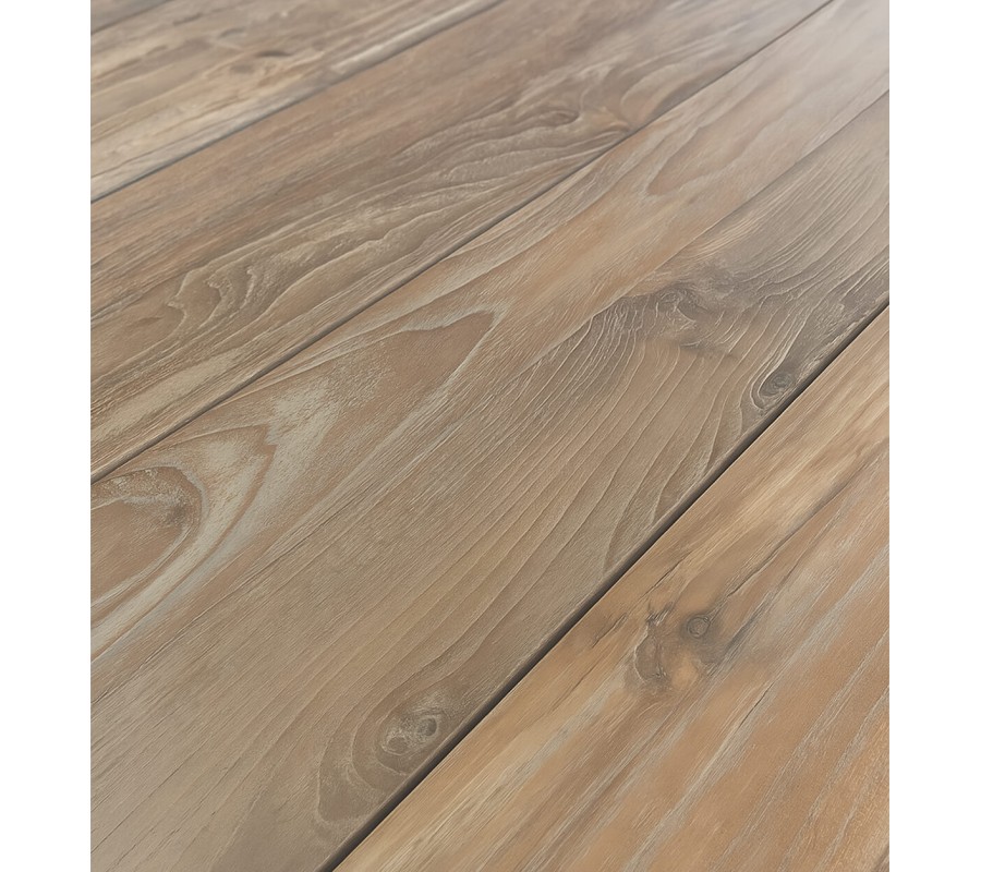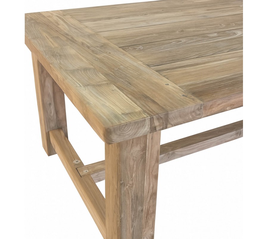 Je vyrobený z recyklovaného masívneho teakového dreva v príjemnom svetlom hnedom prevedení. Povrch má výraznú štruktúru letokruhov, ktorá pripomína organický pôvod materiálu a pôsobí teplým dojmom. Recyklované drevo prepožičiava stolu vintage vizuál a osobitý charakter. Tento materiál je zároveň ekologický a šetrný k životnému prostrediu.