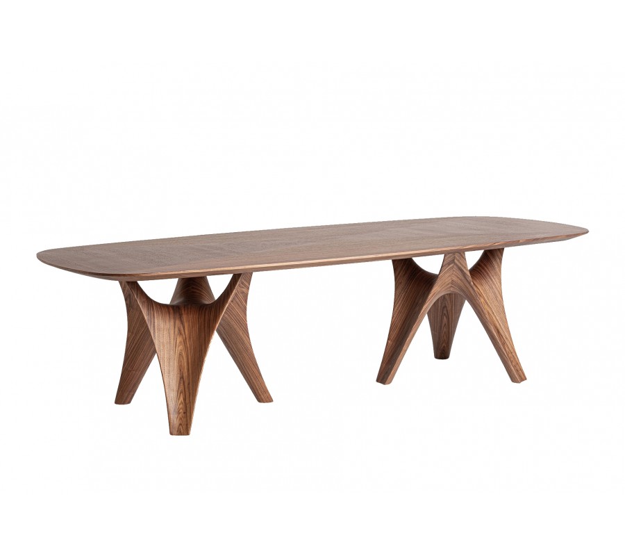 Stôl vás na prvý pohľad zaujme svojou siluetou, ktorá kombinuje hladké rovné povrchy s dramatickými zakriveniami. Dizajnu dominuje dvojica mohutných nôh, symetricky umiestnených na oboch stranách stola. Každá noha má tri ramená vyčnievajúce nahor, ktoré držia vrchnú dosku. V spodnej časti ich dizajn zrkadlí trojica predĺžených nožičiek. Jednotlivé prvky na seba nadväzujú v plynulej konštrukcii s výraznými oblúkmi, ktorá pôsobí moderným geometrickým dojmom. Vrchná doska stola má jednoduchý obdĺžnikový tvar s výrazne zaoblenými rohmi, ktoré korešpondujú so siluetou podstavy.