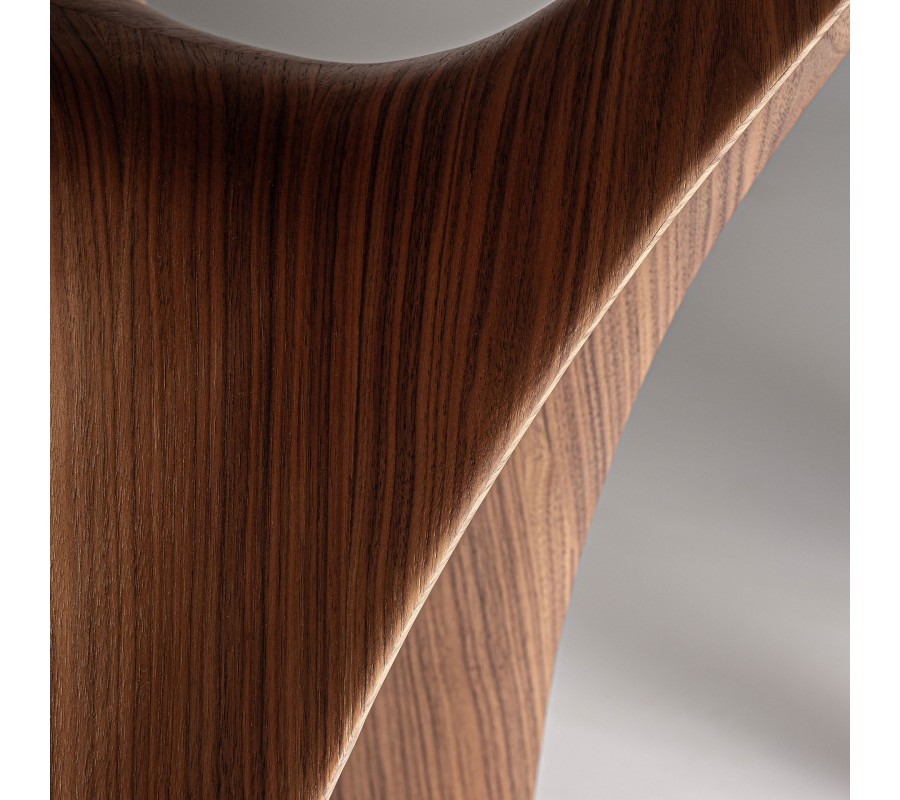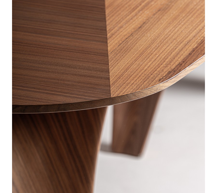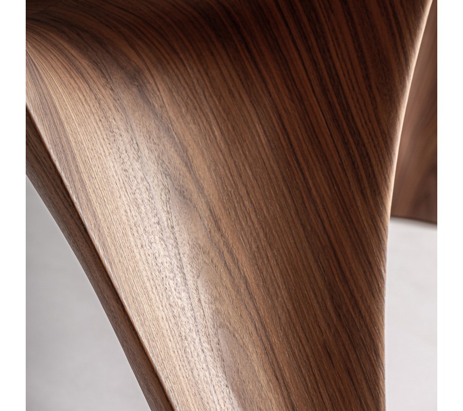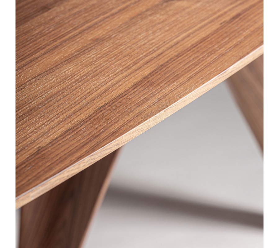 Stôl je vyrobený z kvalitnej orechovej dyhy, ktorá mu prepožičiava svoju bohatú hnedú farbu. Na povrchu sa pravidelne striedajú tenké tmavšie a svetlejšie odtiene. Kresba letokruhov je organizovaná lineárne a zdôrazňuje tak moderné tvary. Nohy sú spevnené sklolaminátom a nábytok je tak pevný, odolný a stabilný.